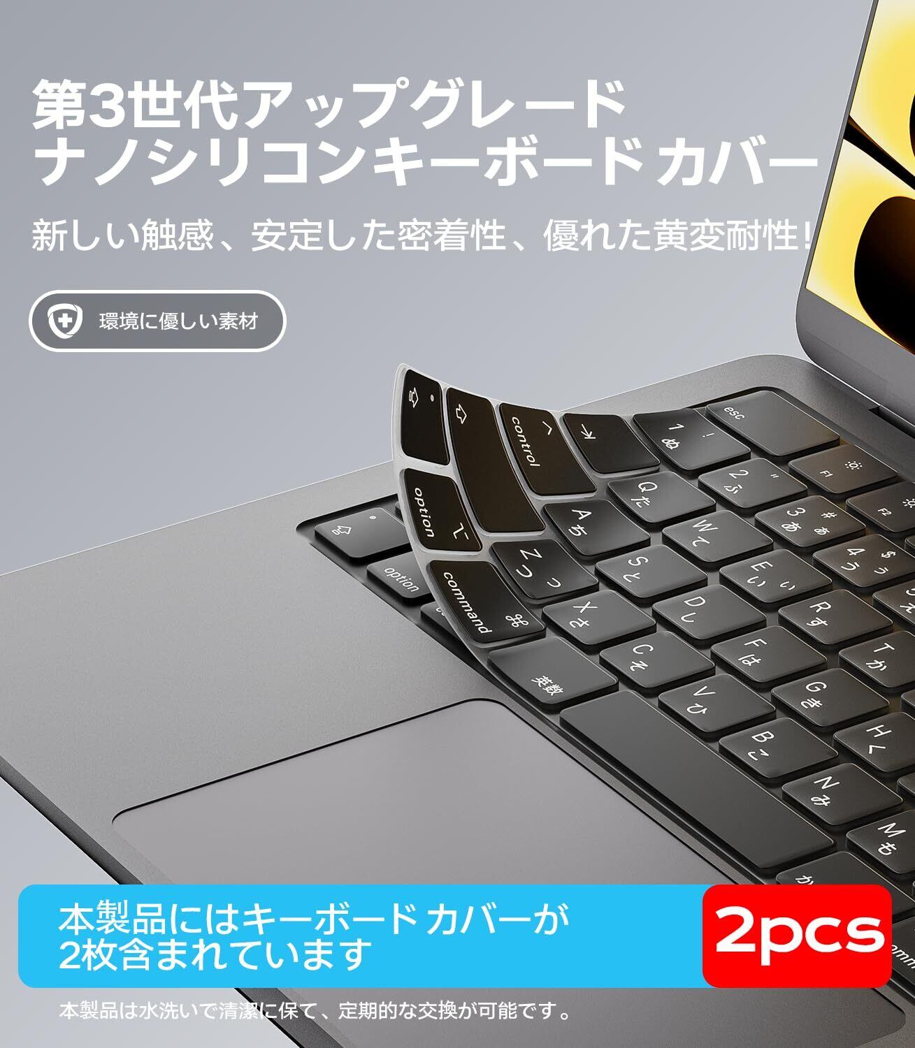MacBook を清潔に、快適に使い続けるための必需品 日々の作業やカフェでの利用、通勤中のバッグ収納――あなたの MacBook は、ホコリ・皮脂・飲み物の飛び散りといった汚れに常にさらされています。 この 高品質シリコン製キーボードカバー は、そんな日常のリスクからキーボードをしっかり守りながら、快適なタイピング体験を損ないません。 ■ 超薄設計で、違和感ゼロの打鍵感 厚さわずか 0.3mm(※実測値)の極薄シリコン素材を採用。キーのストロークを妨げず、素早いタイピングや長時間の文書作成でもストレスを感じません。 表面はソフトタッチのマット仕上げで、指紋やベタつきが目立ちにくく、常に清潔感を保てます。 ■ M4/M3/M2 モデルに完全対応|JIS配列も正確にカット MacBook Pro 14インチ/16インチ、MacBook Air 13.6インチ/15インチ(対応モデル:A3112, A3401, A3185, A3403, A3186, A3113, A3114, A2681, A2941)すべてのポート位置・キートップ形状に合わせて精密に開口。 日本語ユーザーに欠かせない 「かな」「英数」キーを含むJIS配列 も完全対応。装着後もスムーズに切り替え操作が可能です。 ■ 防塵・防水・耐久性――3つの安心 防塵:細かいゴミや髪の毛がキースイッチ内部に入り込むのを防止 防水:コーヒー・水などの軽微なこぼれからキーボードを保護(※完全防水ではありません) 耐久性:高品質シリコン素材は黄ばみ・劣化に強く、長期間美しい状態を維持 ■ 2枚入りで経済的&衛生的 1枚は日常使い、もう1枚は予備や交換用として。 定期的な交換で、常に清潔な状態をキープできます。 スタイリッシュなブラックカラーが、MacBook の洗練されたデザインに自然に溶け込みます。 ※ご注意:本製品は Apple 純正アクセサリーではございません。 ※推奨環境:M4/M3/M2 チップ搭載の MacBook Pro/Air 14/16/13.6/15インチモデル