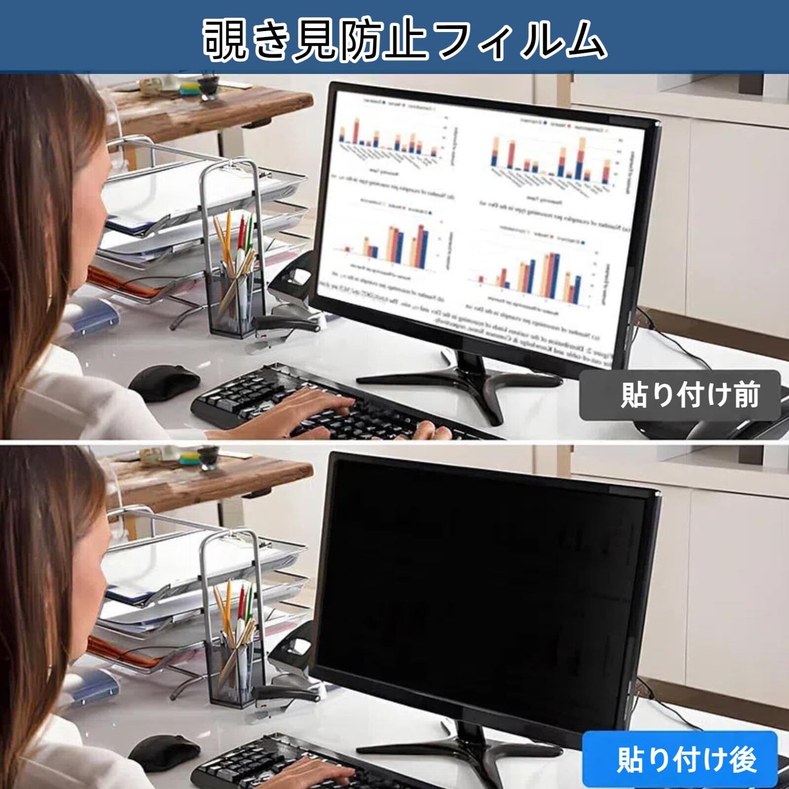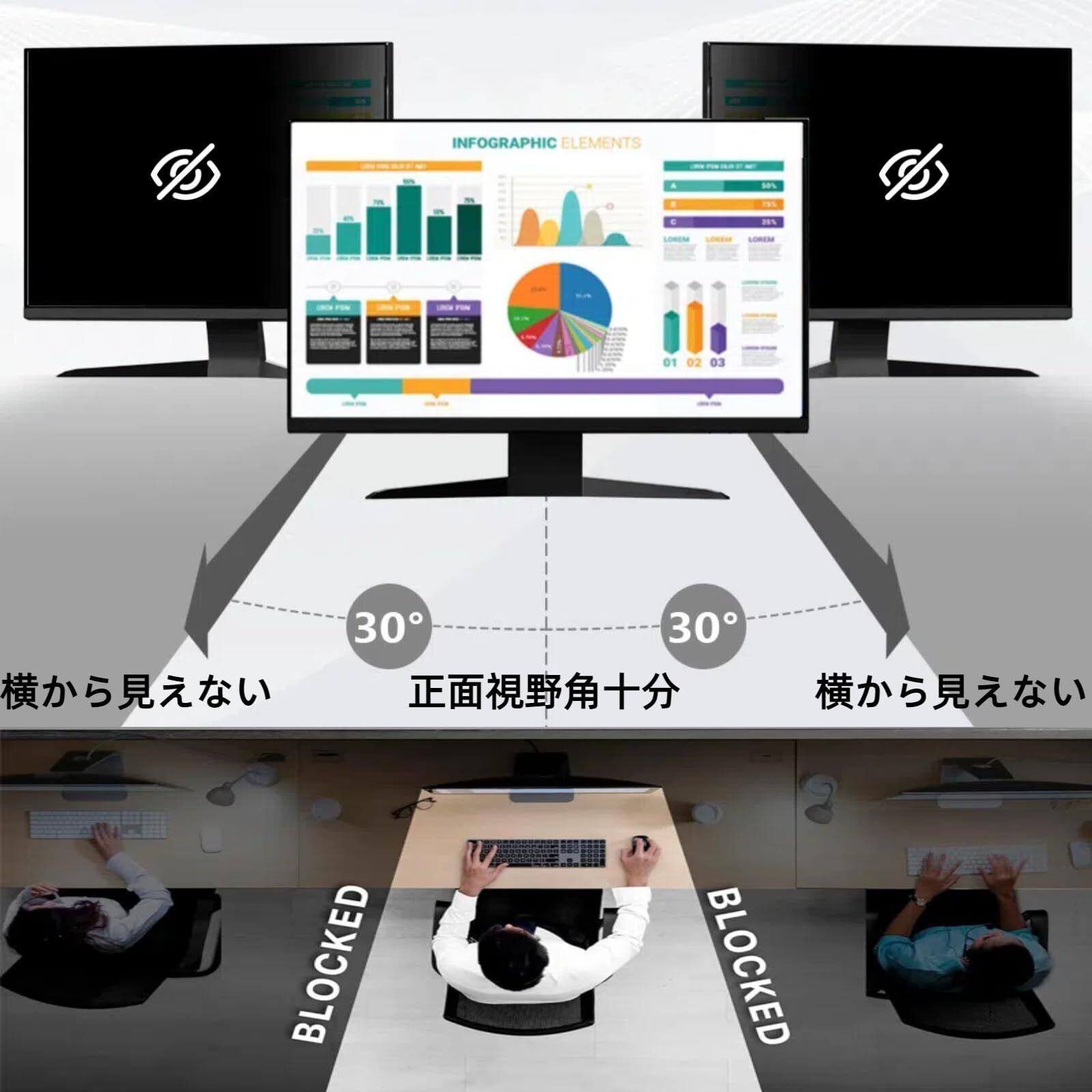 【プライバシー保護】正面からの視認性を保ちつつ、側面からの覗き見を防ぐことができます。約60度の視野角(左右30度)を越えると、画面が暗く表示されるため、オフィス・飛行機・新幹線やカフェで作業をしていても情報の漏洩リスクを回避することができます。