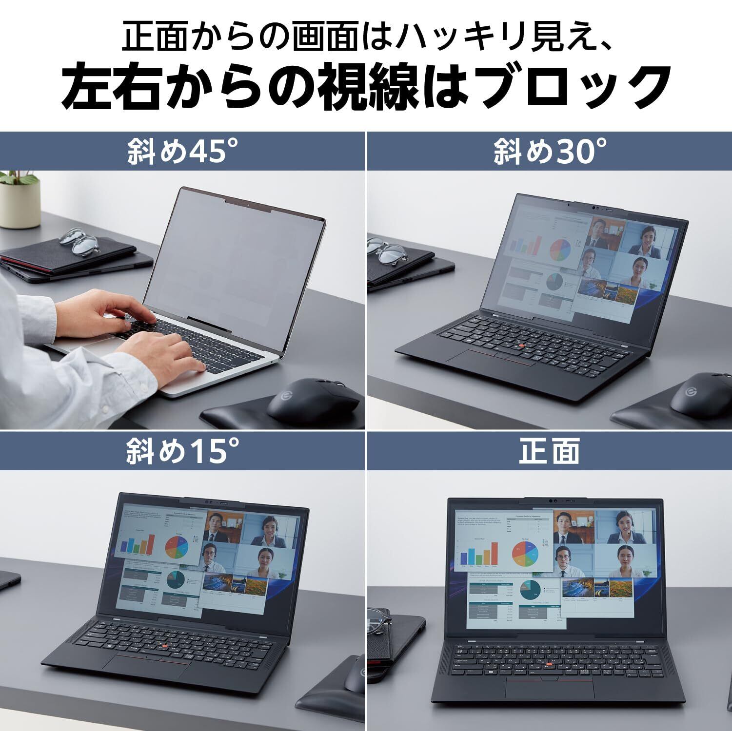 画面の正面を中心に60度(左右約30度)より外の角度からは画面がまっ黒に見えるので、パソコン画面を見られる心配がありません。