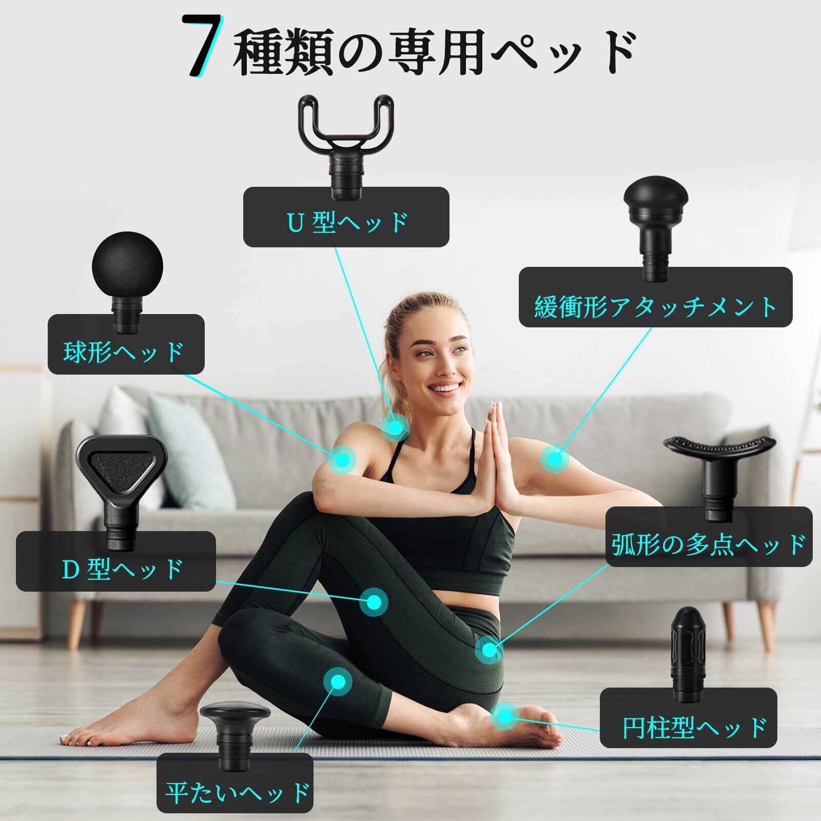 「7つの異なるアタッチメント&タッチパネル式」7つのアタッチメントが付属しており、用途に応じて簡単に交換して使用できます。緩衝型アタッチメントは柔らかく、肩などデリケートな筋肉にぴったりフィットします。タッチパネル式で、直感的な操作とスタイリッシュなデザインを両立させ、使いやすさも抜群です。