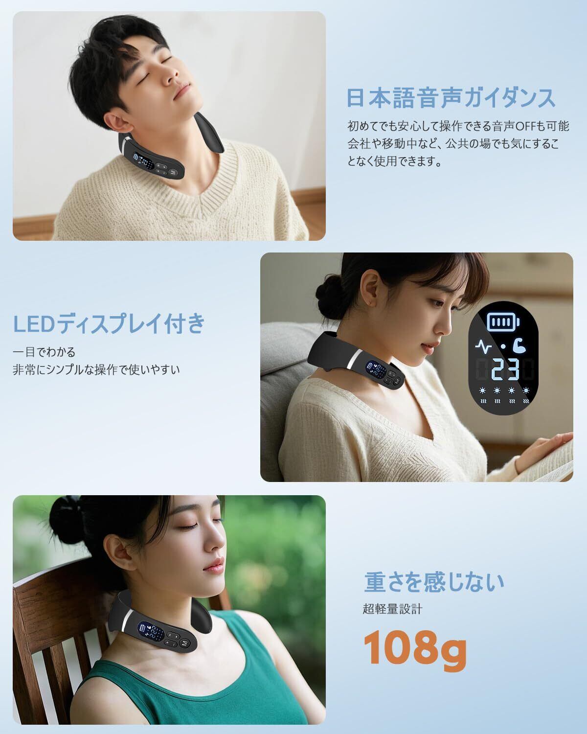 【温度調節・15分自動off】4つの温度モードが備わっており、環境に応じて調節できます。過熱防止装置を内蔵、15分連続稼働後自動的に止まり、過度使用を防ぎます。従来のリラクゼーション器とは異なり、手のひらサイズと超軽量設計を採用し、重力の呪縛から解放され、使用者の首への負担を最低限に!ご自宅はもちろん、外出時やオフィスいつでもどこでも、手軽にご使用いただけます。