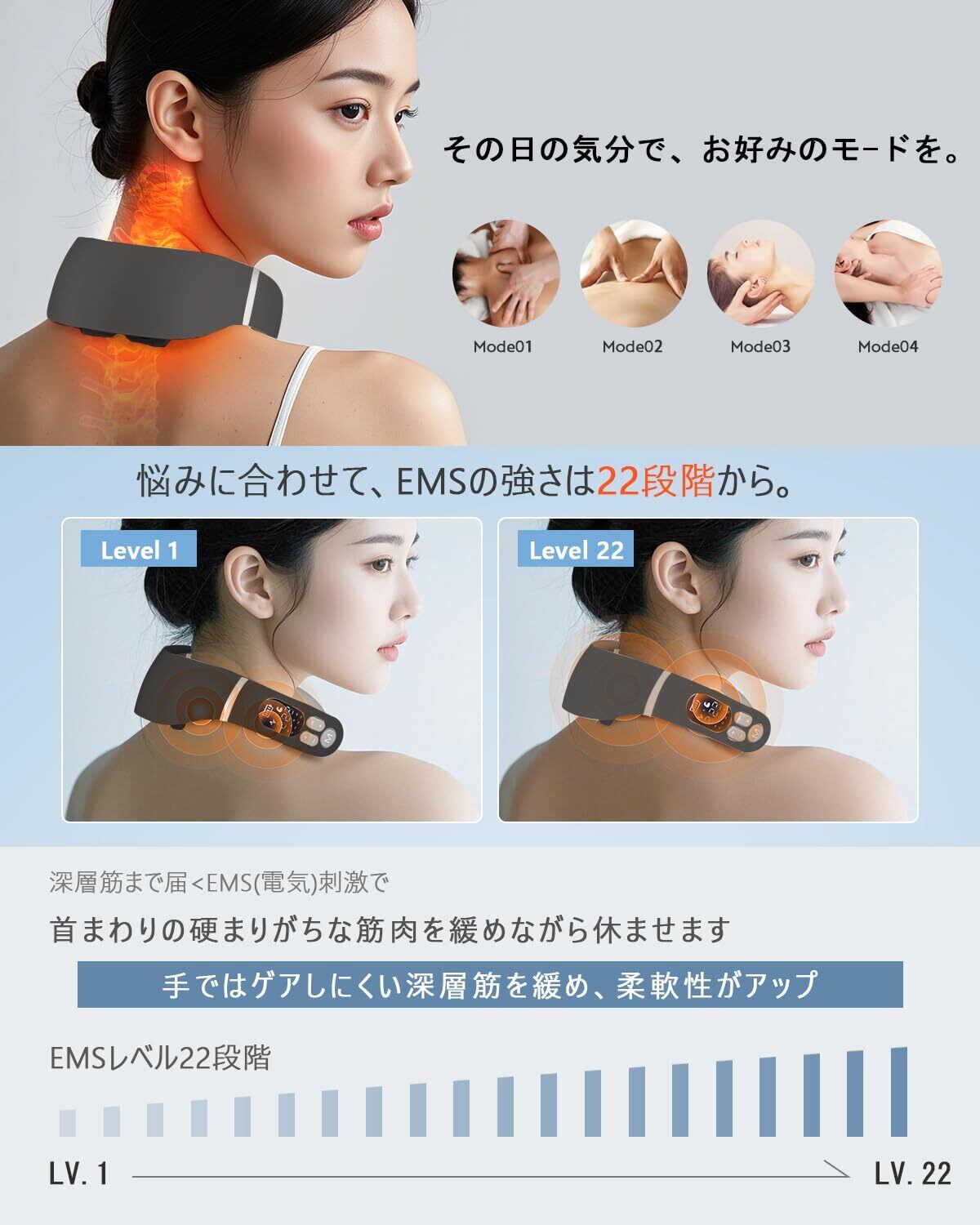 【12つモード・22段階強度】12種類モードがあり、22段階強度、個々の好みや体の状態に合わせて適切なモードと強さを選びいただき、家にいながら充実したリラックス体験を楽しむことができます。ボタンを操作してモードを切り替えることできます。なお、優れたデザインで、装着感もよいです。軽量かつコンパクトなので、持ち運びや保管も簡単です。スタート時にレベル1から立ち上がります。一日たった15-30分でオススメ!