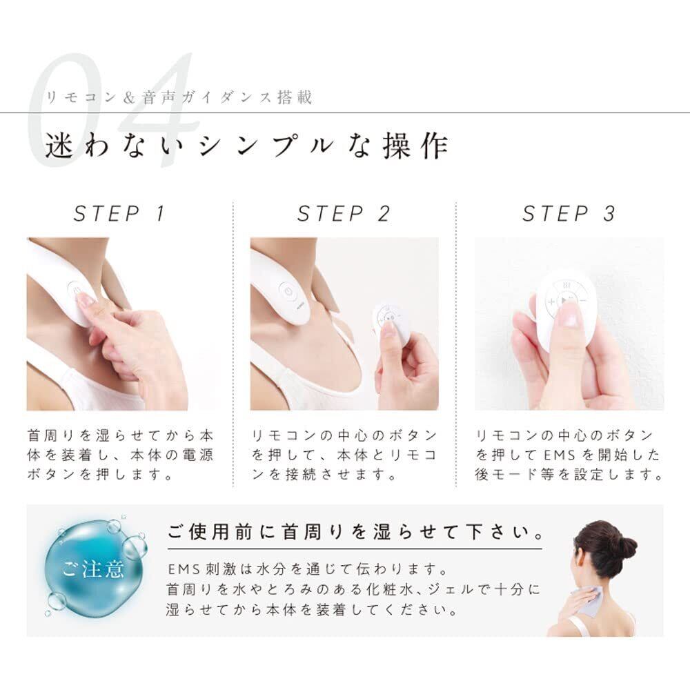 【迷わないシンプル操作】①首周りを湿らせてから本体を装着し、本体の電源ボタンを押します。②リモコンの中心のボタンを押して本体とリモコンを接続させます。③リモコンの中心ボタンを押して運転を開始した後モードや強さ設定をします。