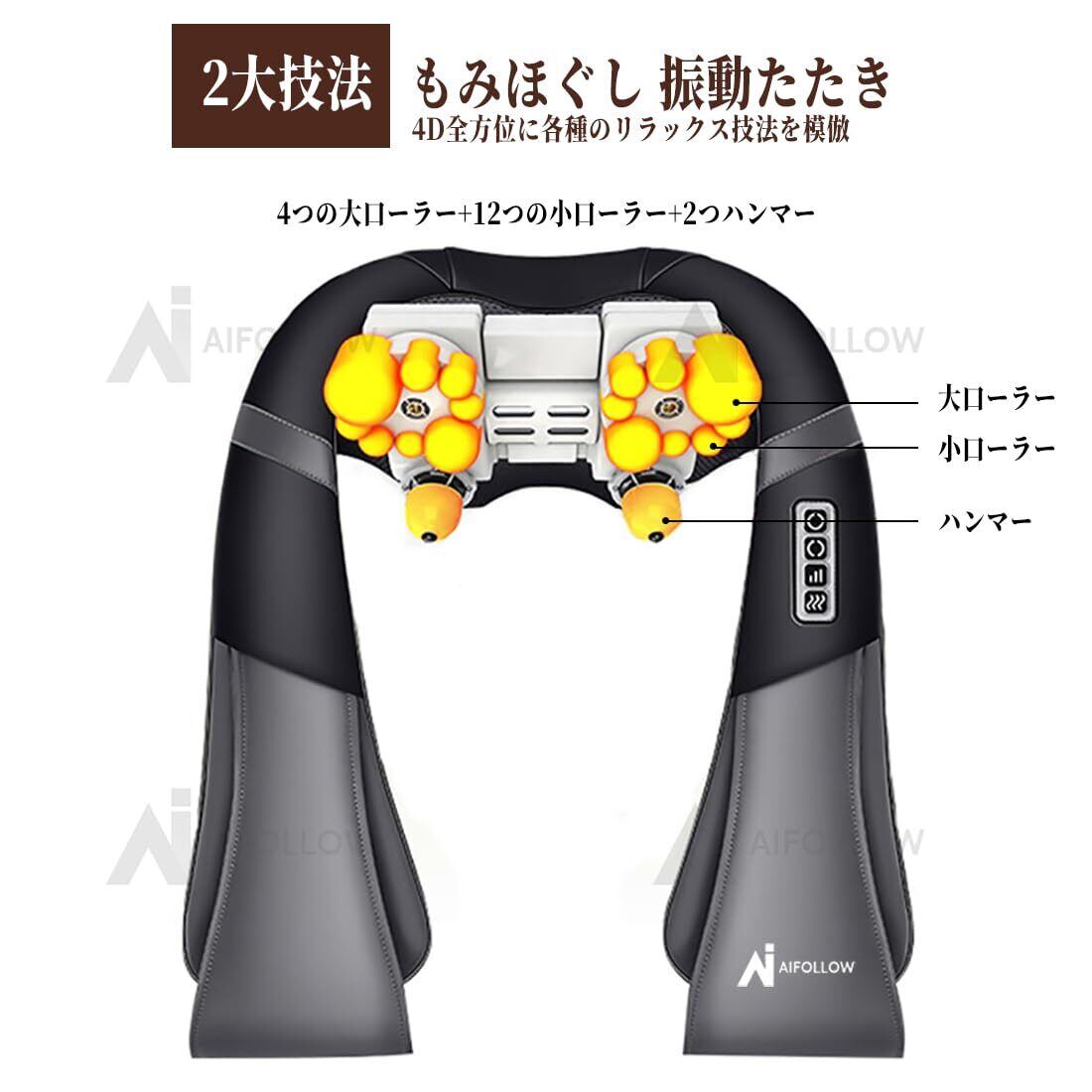 【16つの正反転ローラーと2つのハンマー玉】4つの大ローラー+12つの小ローラー+2つハンマー玉付き、4D全方位。本製品には2種類の動作モードがあります。モードボタンを1回押すと正回転の揉みモードになり、もう1回押すと逆回転の揉みとたたきの同時モードになります。