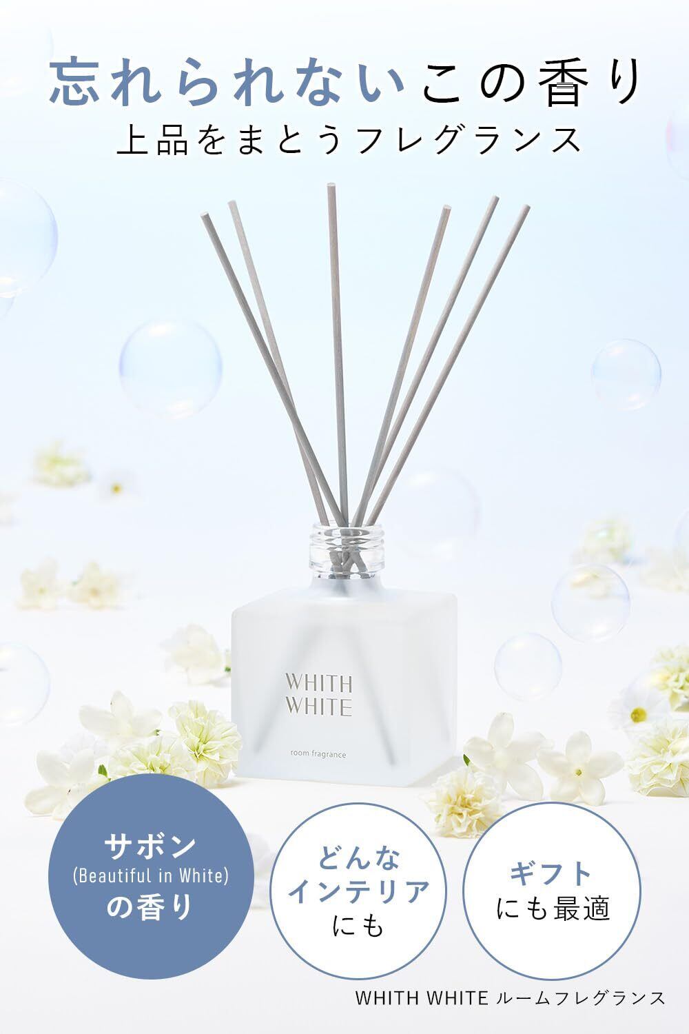 【インテリアに溶け込む】WHITH WHITE(フィス ホワイト) ルームフレグランス ギフト 香りが変化する 爽やか 優しい香り リードディフューザー 芳香剤 スティック付き 200ml 約2.5ヶ月分 サボン (Beautiful in White)