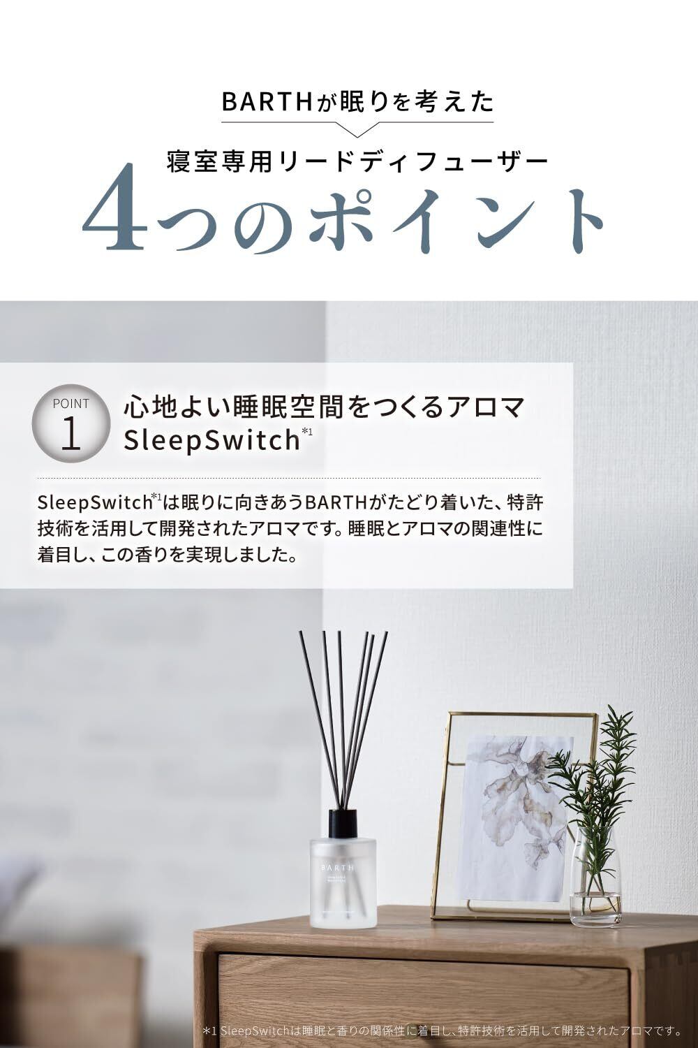 心地よい睡眠空間をつくるアロマSleepSwitch*と、天然精油をBARTHオリジナルのバランスでブレンドしたリードディフューザー