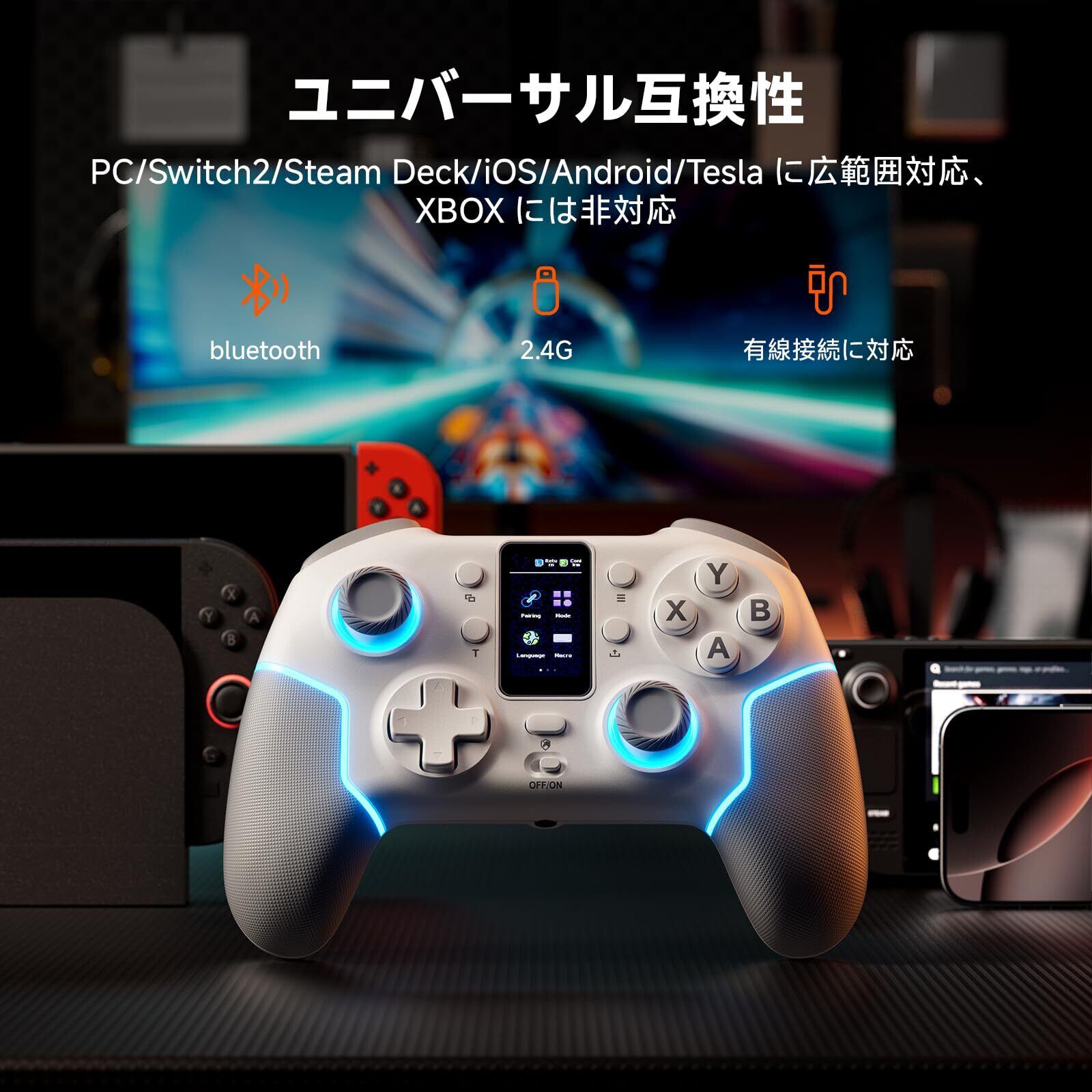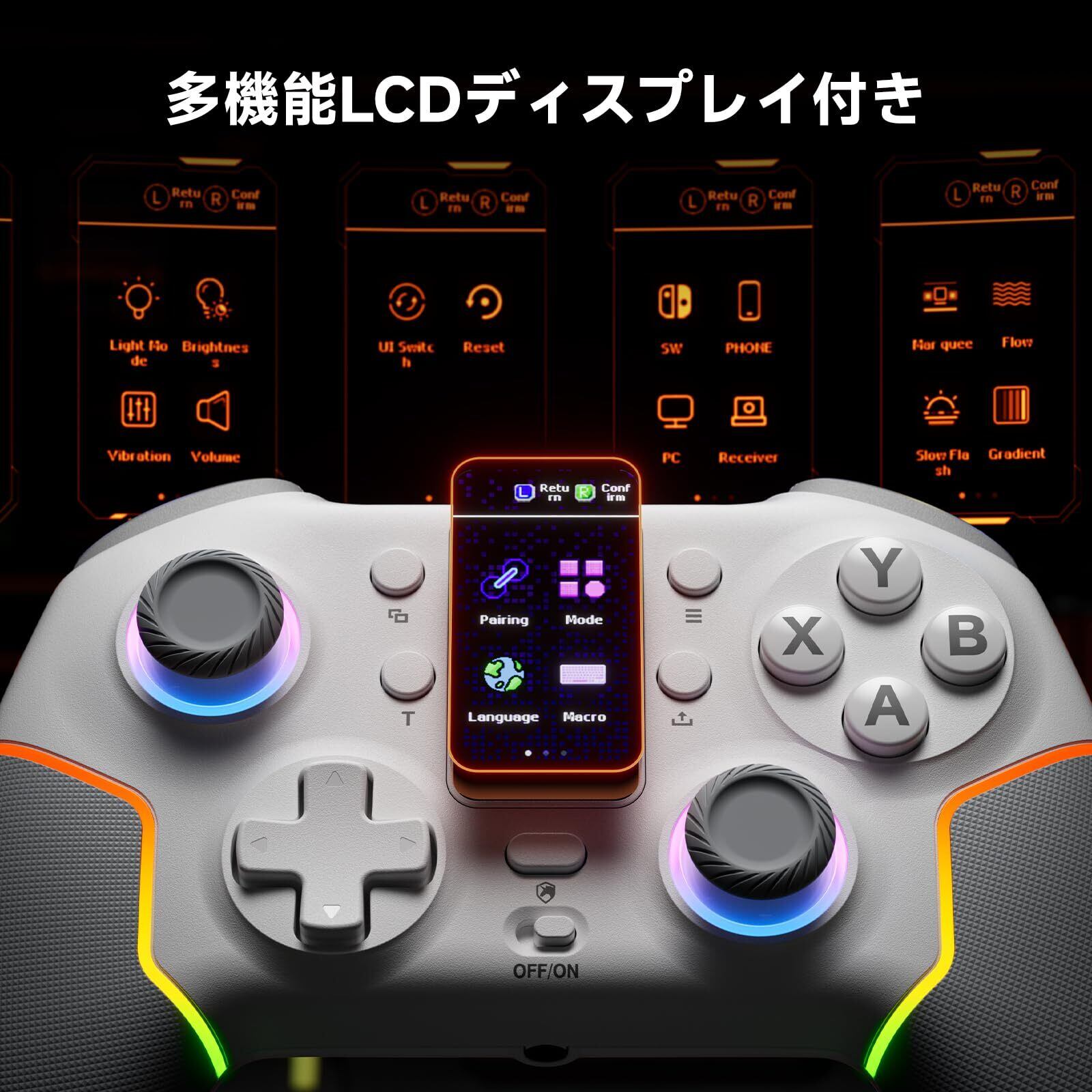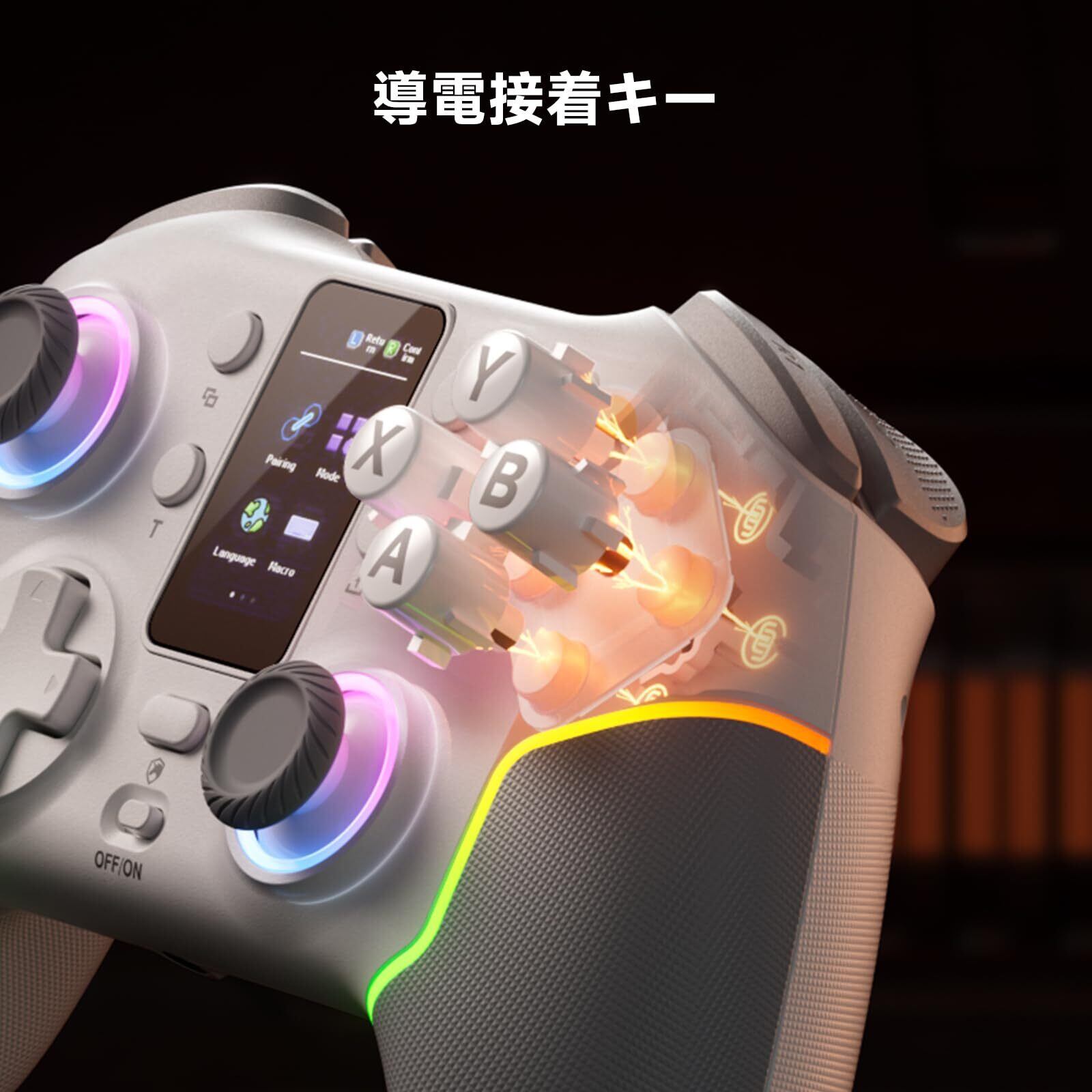 【在庫セール】ECHTPower PC コントローラー 多機能LCDディスプレイ付き Switch2 コントローラー 無線/有線接続 2.4Gレシバー付き イヤホンジャック ホールスティック&トリガー 背面ボタン 1000Hzポーリングレート TURBO連射 RGBライト&振動調整 1000mAhバッテリー PC/Switch2/Android/iOSに対応 ホワイト