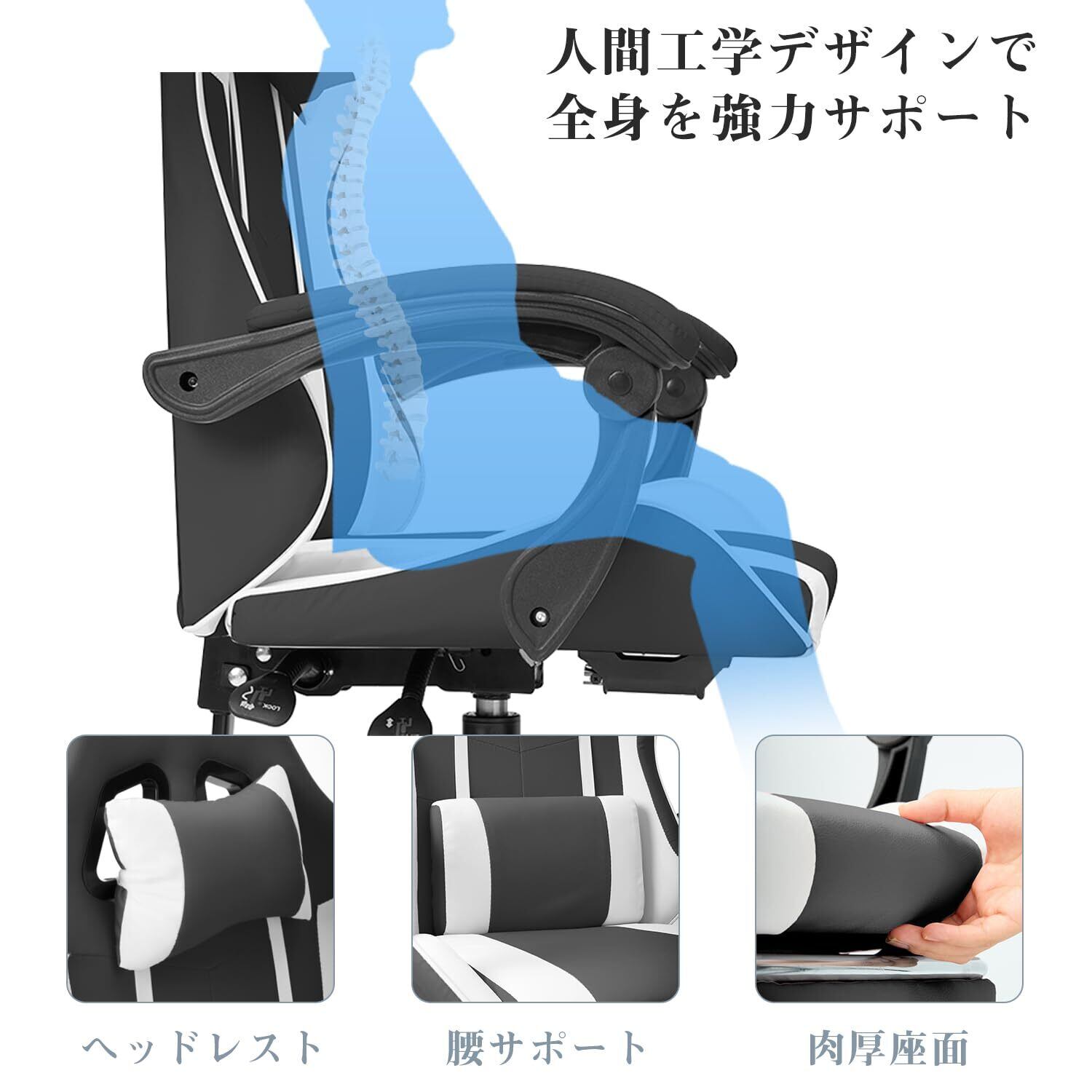 【人間工学に基づいたデザイン】このゲーミングチェアは、人間工学の考えに基づいて設計されており、スタイリッシュなデザインだけでなく、快適な使用体験を最適化しています。頭部、肩部、腰部、座部の4つのポイントをサポートし、背もたれの構造もさらなる進化を遂げ、高級車のシートに座っているような感覚を提供します!ハイバックのデザインは頭までフィットし、たまらない快適さがあります!可動式のランバーサポートにより、腰のS字にぴったりとフィットし、理想的な姿勢を保つことができ、負荷を軽減します!勉強用の学習椅子として、仕事や在宅ワーク用のオフィスチェアとして、また休憩時にも最適です。