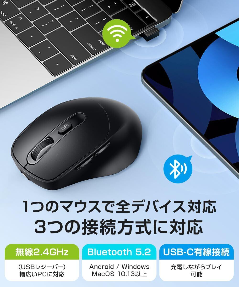 【数量限定】マウス Bluetooth 無線 【人間工学設計|戻る進むボタン搭載|2WAY接続】 ワイヤレスマウス 戻る 進む 5ボタン 搭載 軽量 静音Type-C 充電式 3段階DPI切替 800/1200/1600 USB ワイヤレス ブルートゥース テレワーク ゲーミング 持ち運び ノートパソコン パソコン レシーバー付き iPad/PC/Windows/macbook/Mac対応