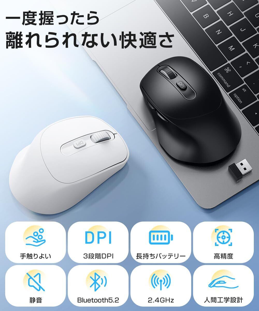 【2WAY接続対応|2.4GHz&Bluetooth5.2】Bluetooth接続とUSBレシーバー接続の2WAY仕様で、デバイスを切り替えてスムーズに使用可能な Bluetooth マウス です。 ワイヤレスマウス 充電式 にはレシーバー付きなのでBluetooth非対応のPCでも安心です。マウス Bluetoothとしても、ワイヤレスマウス USBとしても使える高い互換性が魅力です。