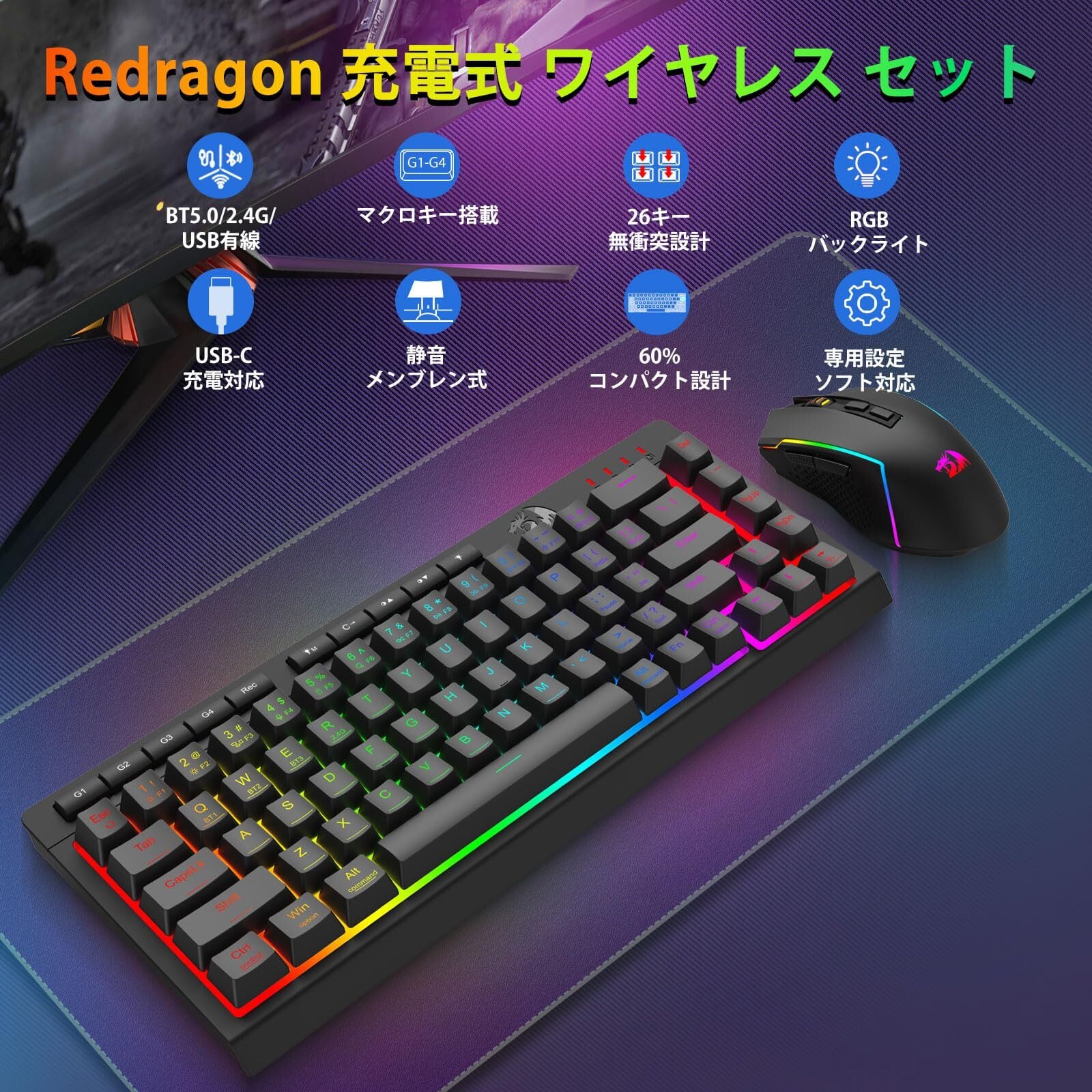 Redragon ワイヤレス ゲーミング キーボード&マウスセット 60% テンキーレス 【BT/2.4G/USB有線】 英語配列 静音メンブレン 12800DPI 光学ゲーミングマウス 充電式 RGB マクロ対応 Windows/Mac/PS5/Android 多機種対応 (ブラック)