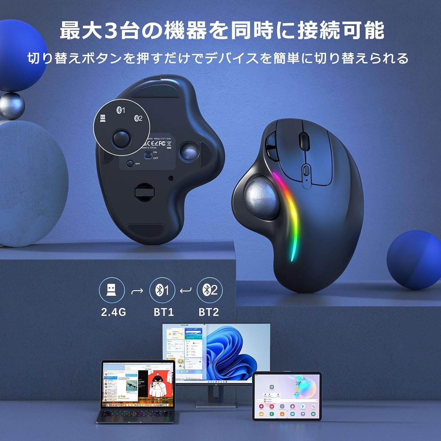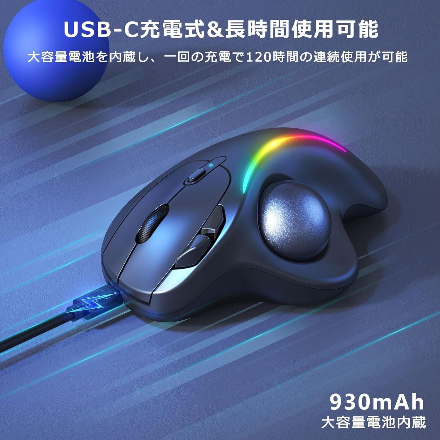 【カッコいいRGBライト】美しさと機能性を兼ね備えているモデル。トラックボールの上部にはRGBライトが搭載され、手元で美しく輝きます。カラフルなLEDライトの変換による素晴らしい視覚効果で、ガッコいい雰囲気を最大に盛り上げてくれます。LED変更ボタンを押すだけで、流水モード、呼吸モード、常点灯モードやウェーブモードなど、4つのパターンから光り方を選べて、オフもできます。これ1台で、毎日の仕事と学習をカラフルに!【耐久性抜群】Bluetoothマウスの表面は傷・指紋がつきにくいマットな質感で、サラサラと手に馴染みやすいです。裏面に滑り止め加工を施しているので、しっかりと机に固定され、安心してお使いいただけます。