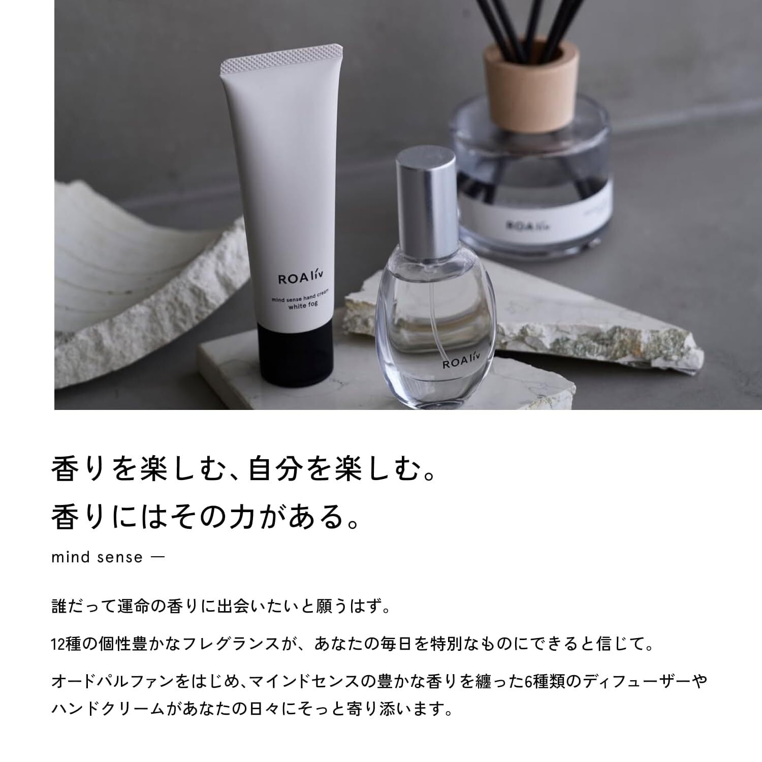 <マインドセンスについて> ベースに100%植物由来エタノールを用いたナチュラル発想のオードパルファン。澄んだ香り立ちとマイルドな肌当たりが特徴です。ボトルデザインは自然界のアートにインスピレーションを得て、丸石の手になじむフォルムから着想しています。