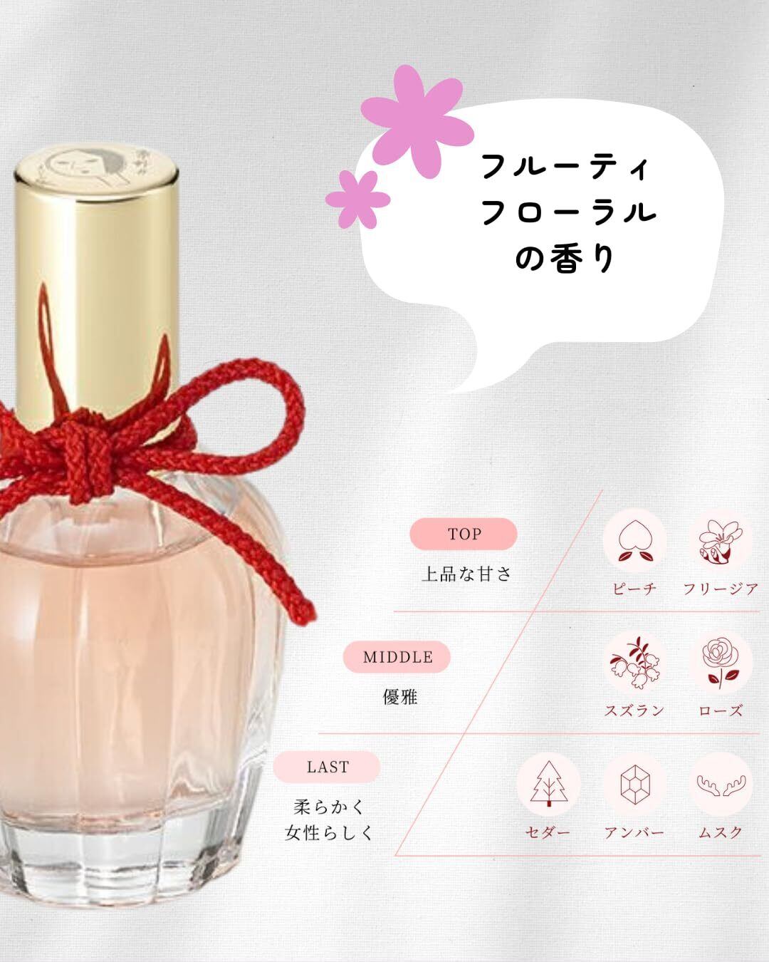 甘すぎず、ふんわりとしたフルーティフローラルの香りで上品な女性らしさを演出。 可愛らしいフォルムが、さらに気分を彩ります。