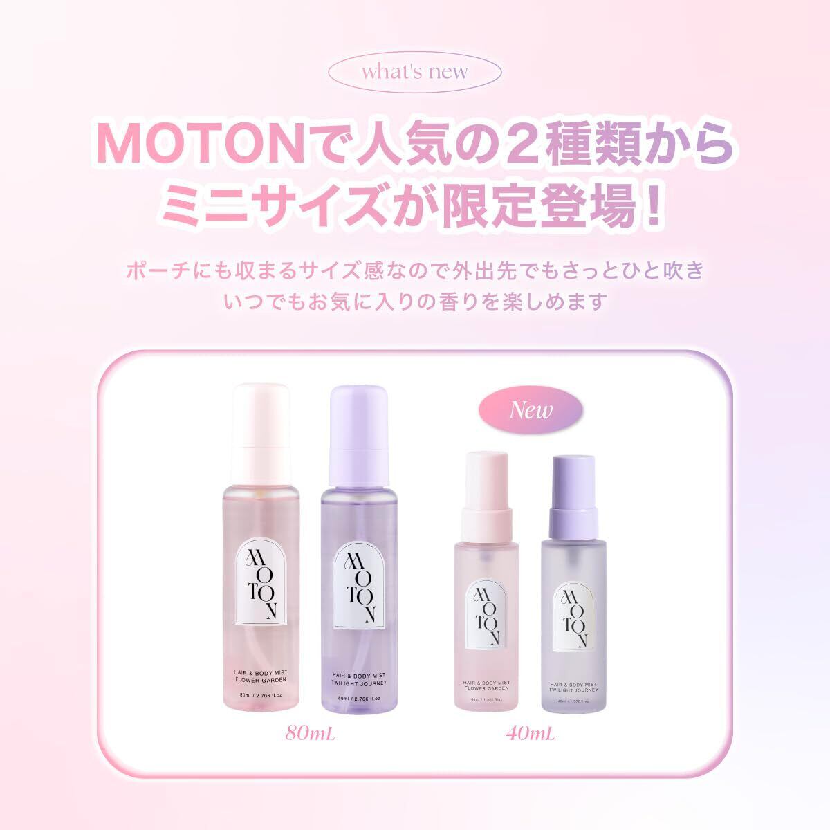 MOTONの大人気の香りがミニサイズで新登場! MOTONは「Any moment from morning to night」をコンセプトにした韓国のヘアケア・ボディケアブランドです。 美容成分も贅沢に配合した、香水のような贅沢な香りをふんわり纏うヘア&ボディミスト。