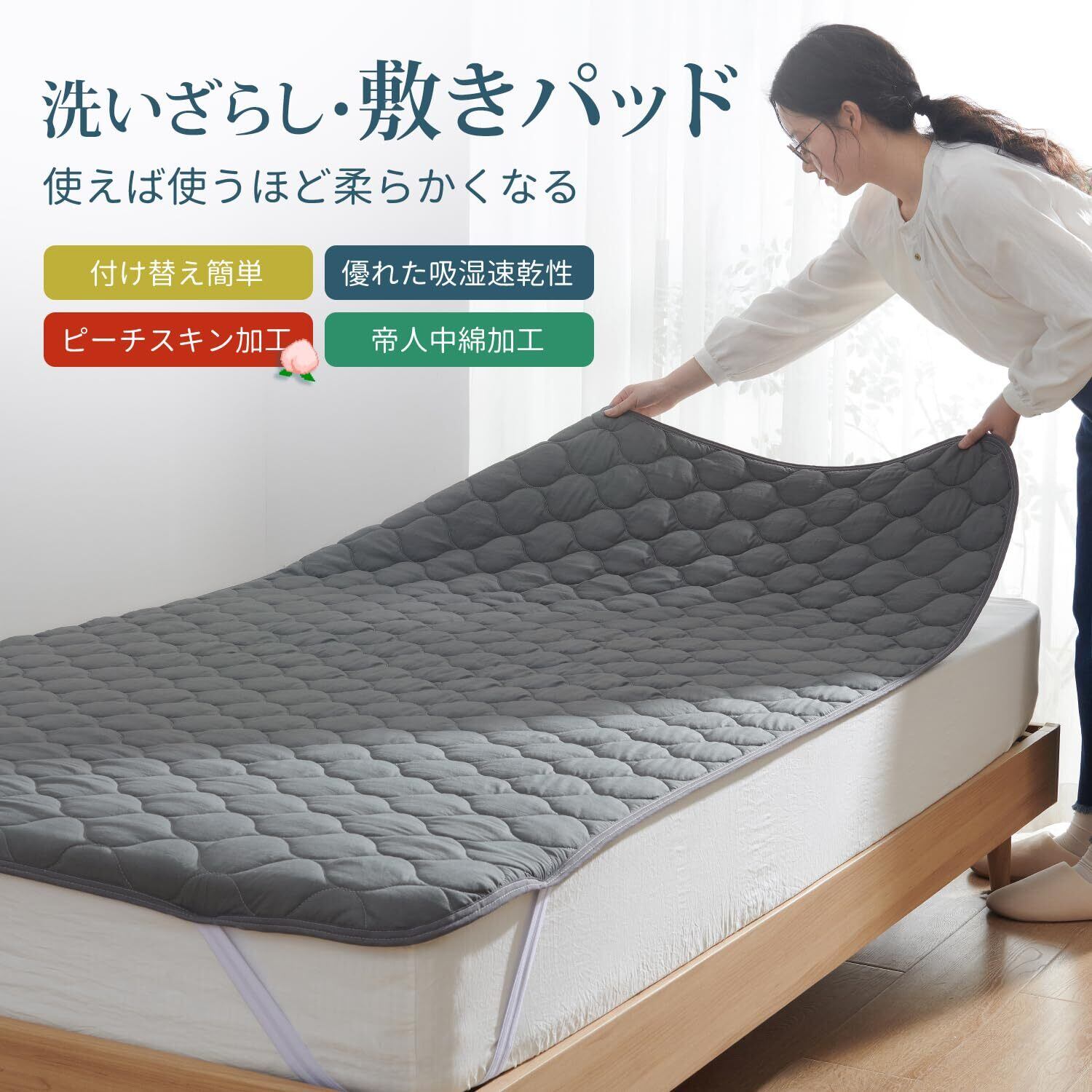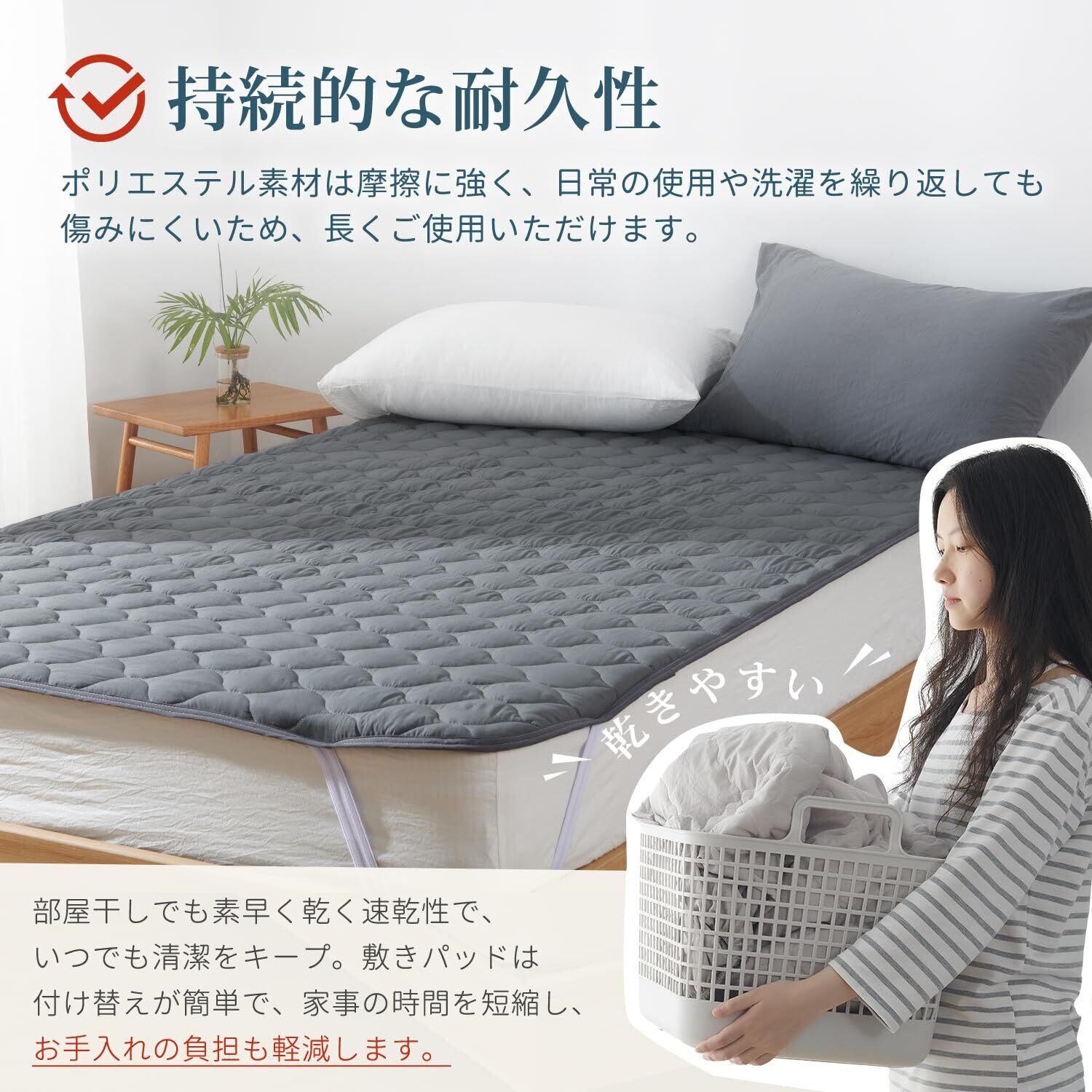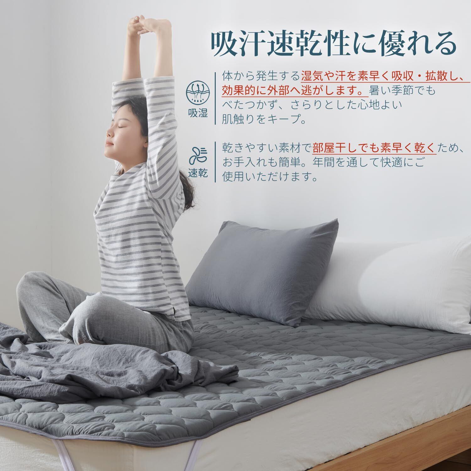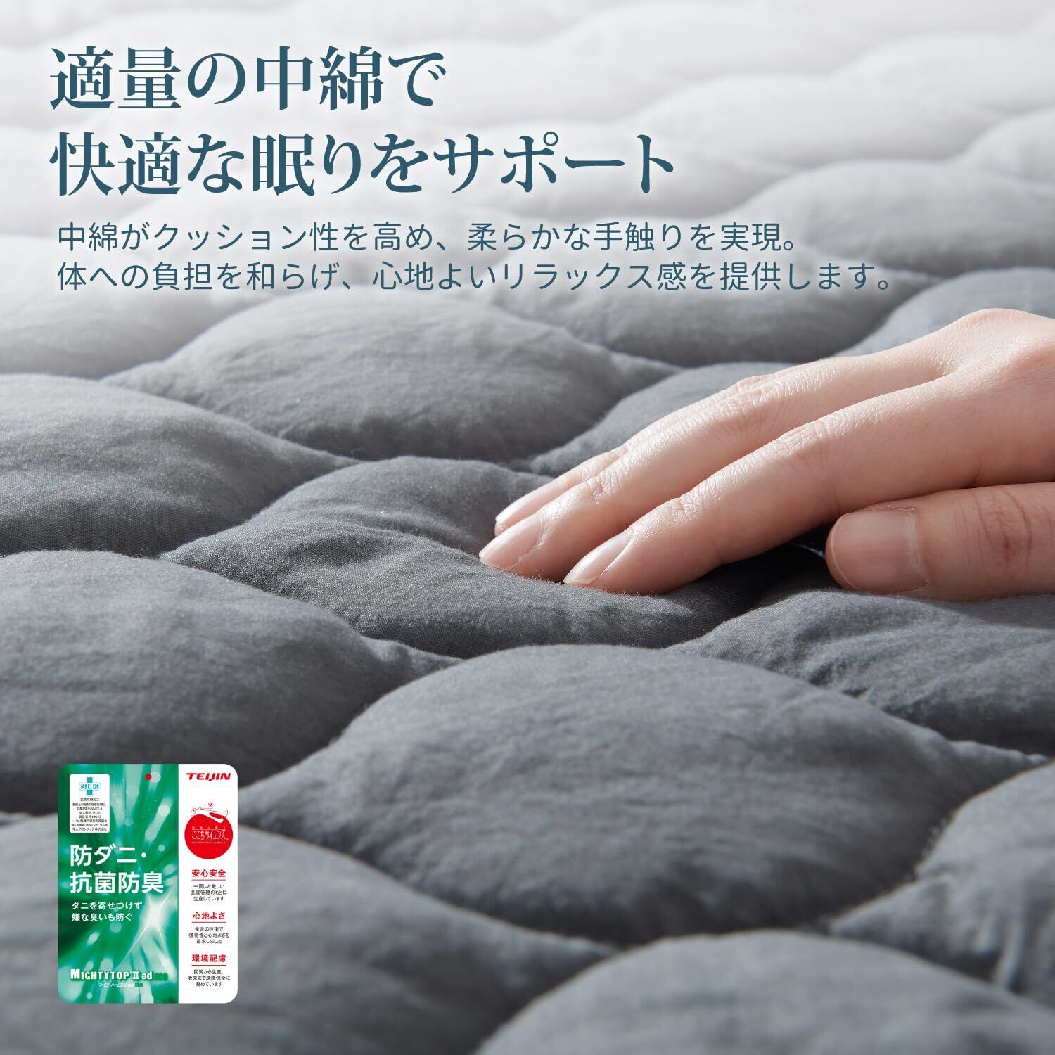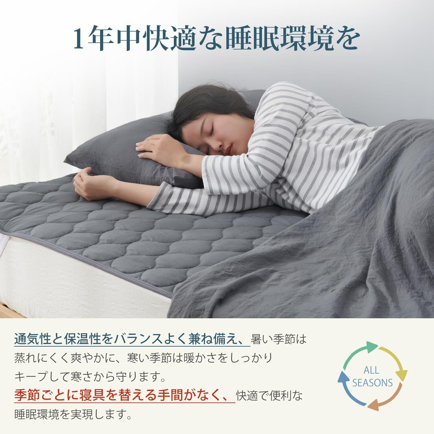 「通気性と速乾性で清潔キープ」高い通気性で湿気を逃し、ムレにくい快適な寝心地を提供します。中綿入りでふんわりとした感触がありながら、速乾性にも優れているため、洗濯後も素早く乾きます。いつでも清潔で快適な睡眠環境を保てます。