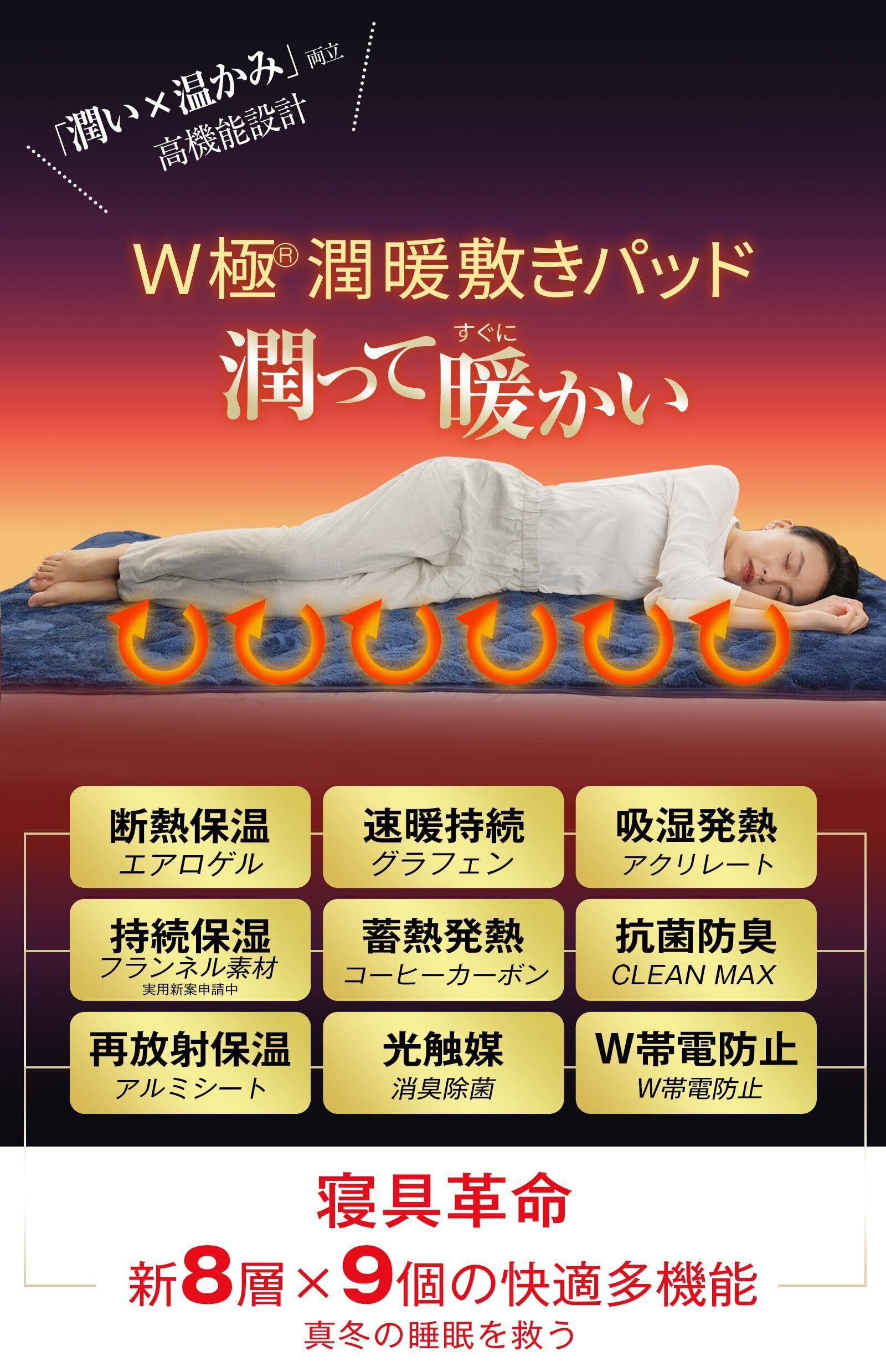 【暖かいだけじゃない!潤暖敷きパッド冬用】冬の「暖かさ」だけでなく「肌の潤い」も求めるなら、このW極モイストフレア潤暖寝具で、乾燥や冷えによる肌の悩みを一掃し、6つの先端テクノロジーが届ける「潤いあふれる暖かさ」を体感してください。独自に開発した業界初となる「持続する水分保持フランネル機能生地」が、独自の技術で超保湿成分を分子レベルでナイロン繊維に定着させ、肌に薄い「潤いの膜」をかけるような奢らかな体感をお届けします。さらに CICA 保湿加工を施すことで、ダブルの保湿効果で、肌が敷きパッドに触れる瞬間から、スキンケア成分が肌をしっかり保護し、自生の潤いを逃がさないようキープ。柔らかさが肌に密着するように寄り添い、寝ている間に自然に潤いを補給してくれるため、冬の乾燥によるチクチク感が一掃されます。冬の二大敵「冷え」と「乾燥」、潤暖 冬用敷きパッド一つで完璧対策!