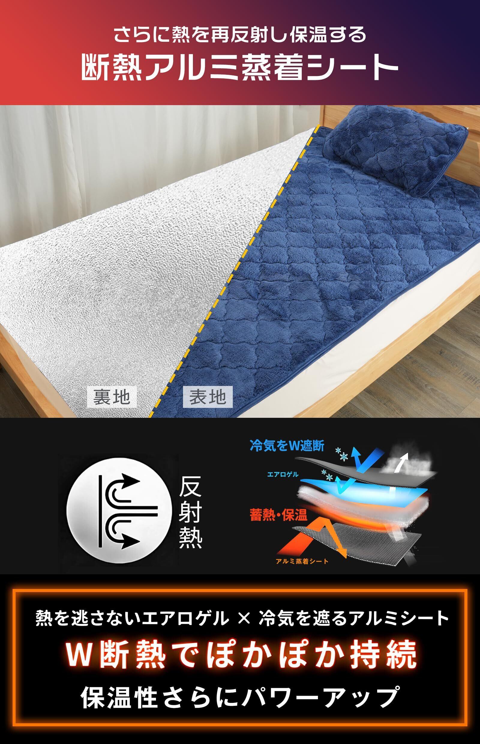 【6大テクノで、真冬の睡眠を「寒さ・蒸れ」フリーに!】宇宙服断熱素材「エアロゲル」と、ノーベル賞受賞「グラフェン」を黄金配合したこの冬用敷きパッド/シーツ)は ——熱をしっかり閉じ込めつつ、外の寒気を一気に遮断。さらに遠赤外線を放射して迅速に発熱し、体の芯までじんわりと温めます。触れたその瞬間暖かさが肌に届き、「冷たい不安」が一瞬で和らぎます。さらに吸湿発熱のトップ級素材「アクリレート」を導入:ウールの2.5倍の発熱力で、体の湿気をすぐ熱に変え、一晩中足元までポカポカ。抜群な放湿性で汗や湿気を速やかに排出し、布団内の蒸れを根絶!抗菌消臭中わた「CLEAN MAX]と環境に配慮した「コーヒー炭素繊維」も搭載:Wの驚きの消臭機能で、汗臭や加齢臭も極力消臭!その上、体熱を反射させるアルミ蒸着シートを加え、体熱を逃がさず再反射します。6つのテクノロジーを集結し、独自の 8 層魔法瓶構造で「速暖・発熱・保温・遮断」を極め —— シーツ内の超温環境を一晩中しっかり保ちます。暖房をつけなくても、真冬の夜を「寒さも蒸れもない」快適睡眠で過ごせる!冬の「冷え」と「乾燥」を潤暖敷きパッド一つで一掃!