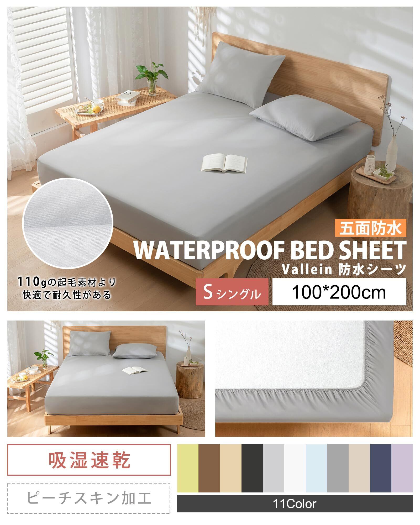 【2022最新】Vallein 防水シーツ 側面完全防水 シングル ボックス 全面防水 マットレスカバー おねしょシーツ セミダブル ダブル ボックスシーツ クイーン キング 大人用 赤ちゃん ベッドシーツ 介護用シーツ ベビー 保育園 防ダニ 丸洗い可能(シングル·ライトグレー·100*200)