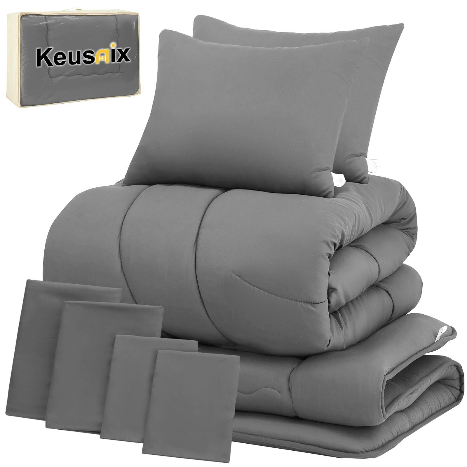 Keusnix 布団セット ダブル 布団9点セット 寝具セット SEK認証 防臭 オールシーズン ふとんセット 洗える 中綿2kg 掛け布団・【高密度固綿入り】五層敷布団・枕*2・布団カバー4点・収納ケース付き ホコリが出にくい ピーチスキン加工 なめらかな肌触り ダークグレー