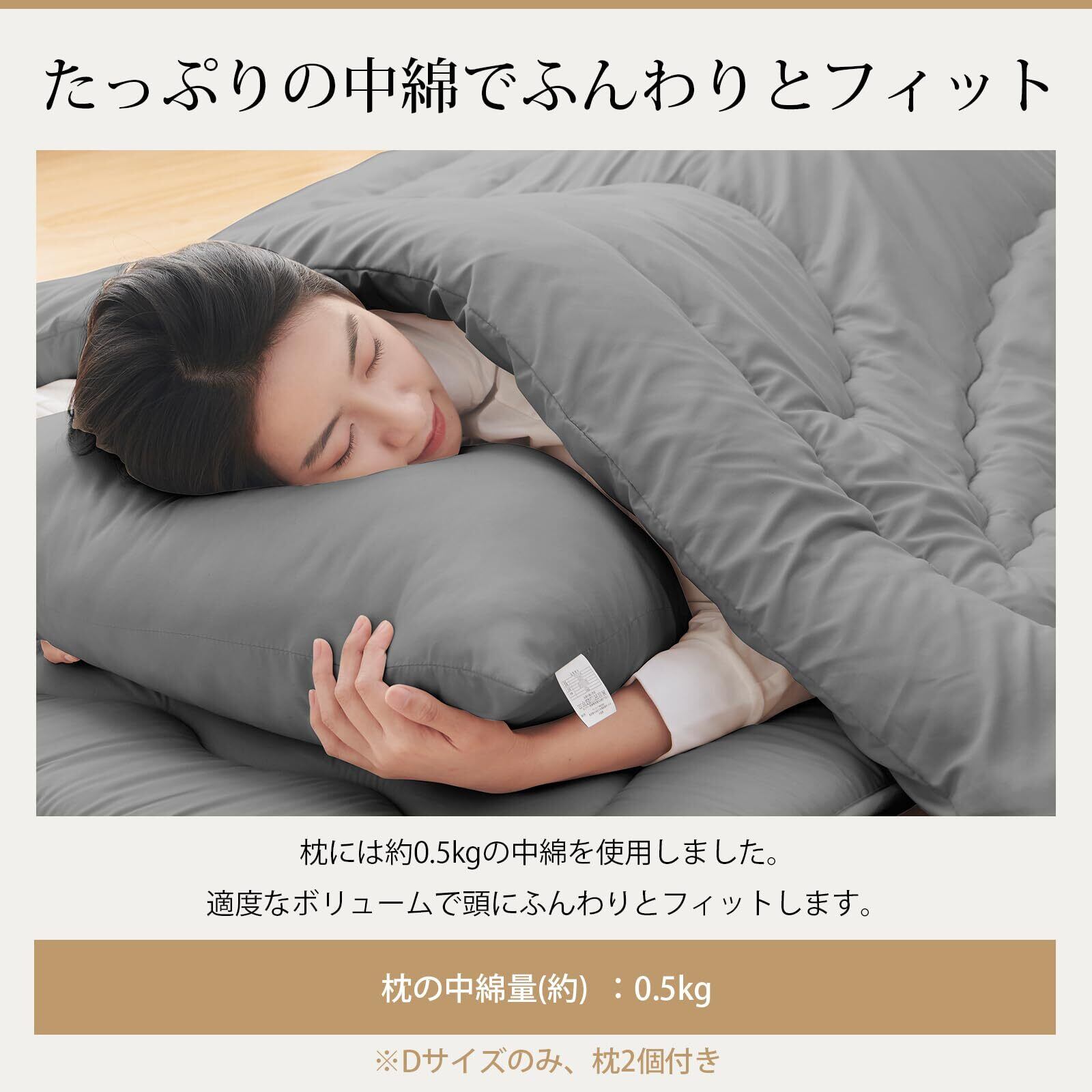 【Keusnix・9点セット内容】D / ダブル:① オールシーズンで使える掛け布団:190×210cm / 詰めもの重量:約2kg。②底付き低減固綿入りの敷き布団:140×210cm 。③中空ポリエステル綿の枕*2:約43×63cm。④なめらか肌触り、ピーチスキン加工付き掛け布団カバー*1、敷き布団カバー*1、枕カバー*2。⑤収納ケース(不織布・PVC)。単身赴任や引っ越し、来客、使用する場面が多く、必要な寝具をこの布団セットだけでお揃いでき、簡潔で便利な寝具セットです。※枕は掛け布団の中に巻かれていますので、開封する時にご注意ください。