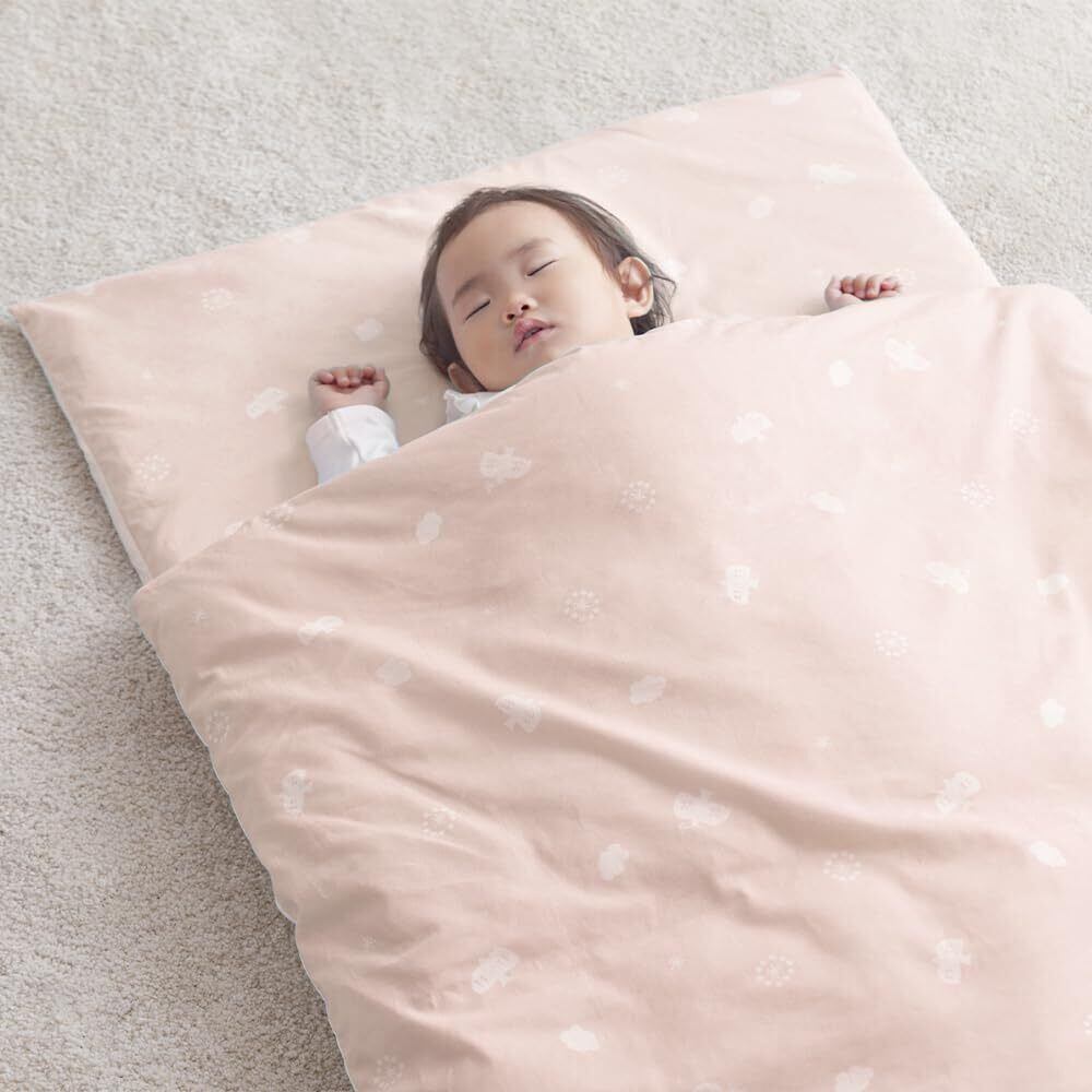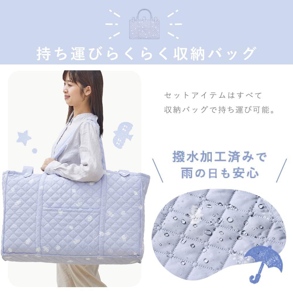 収納バッグ付きなので、使わない時もスッキリ。身体のラインに沿うようにキルティング加工。しっかり包み込み保温性◎。お昼寝にも来客用にも使っていただける優秀な布団セット。