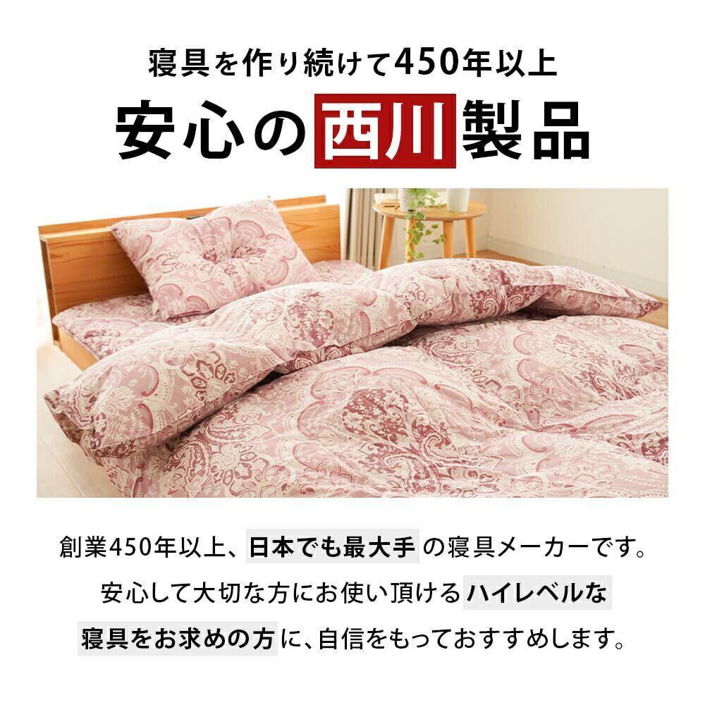 【ふっくら暖かいダック85%羽毛布団×固綿入り三層敷き布団×ふかふかポリエステル枕】ダックダウンを85%配合した軽くてあたたかいスタンダードな羽毛掛け布団です。弾力と保温力に優れ、ふんわりとした掛け心地が続きます。凸凹ウレタンフォーム入りの三層敷き布団は、身体をしっかり支えて体圧を分散します。マットレスに重ねて使うと、寝心地の良さがアップします。スタンダードで使いやすいポリエステル枕は、頭部にフィットするドーナツ枕タイプ。ふかふかソフトなポリエステル中わた入りです。43×63cmの一般的な枕なので色んなカバーに合います。西川は創業450年以上、日本でも最大手の寝具メーカーです。ハイレベルな寝具をお求めの方に、自信をもっておすすめします。