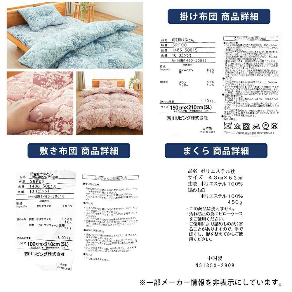【特価セール】西川 布団セット シングル 3点セット 【 羽毛布団 ダウン85% 日本製 150×210 + 体圧分散 固綿 三層敷布団 100×210 + 枕 43×63 】 すぐ使える コンパクト梱包 来客用 新生活 ドーナツ枕 軽量 あたたかい 保温力 弾力 春 秋