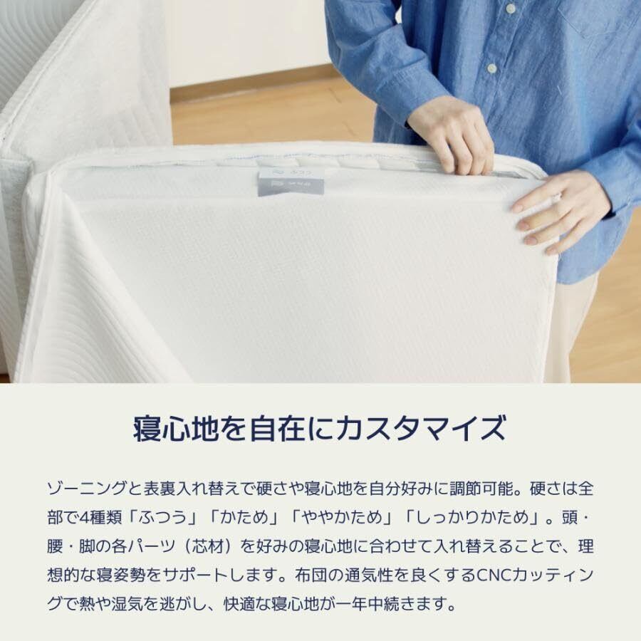 ゾーニングと表裏入れ替えで硬さや寝心地を自分好みに調節可能。3つのブロックは、それぞれ側面によって「ふつう」「かため」「ややかため」「しっかりかため」まで硬さのレベルが異なります。頭・腰・脚の各パーツ(芯材)を好みの寝心地に合わせて入れ替えることで、理想的な寝姿勢をサポートします。布団の通気性を良くするCNCカッティングで熱や湿気を逃がし、快適な寝心地が一年中続きます。