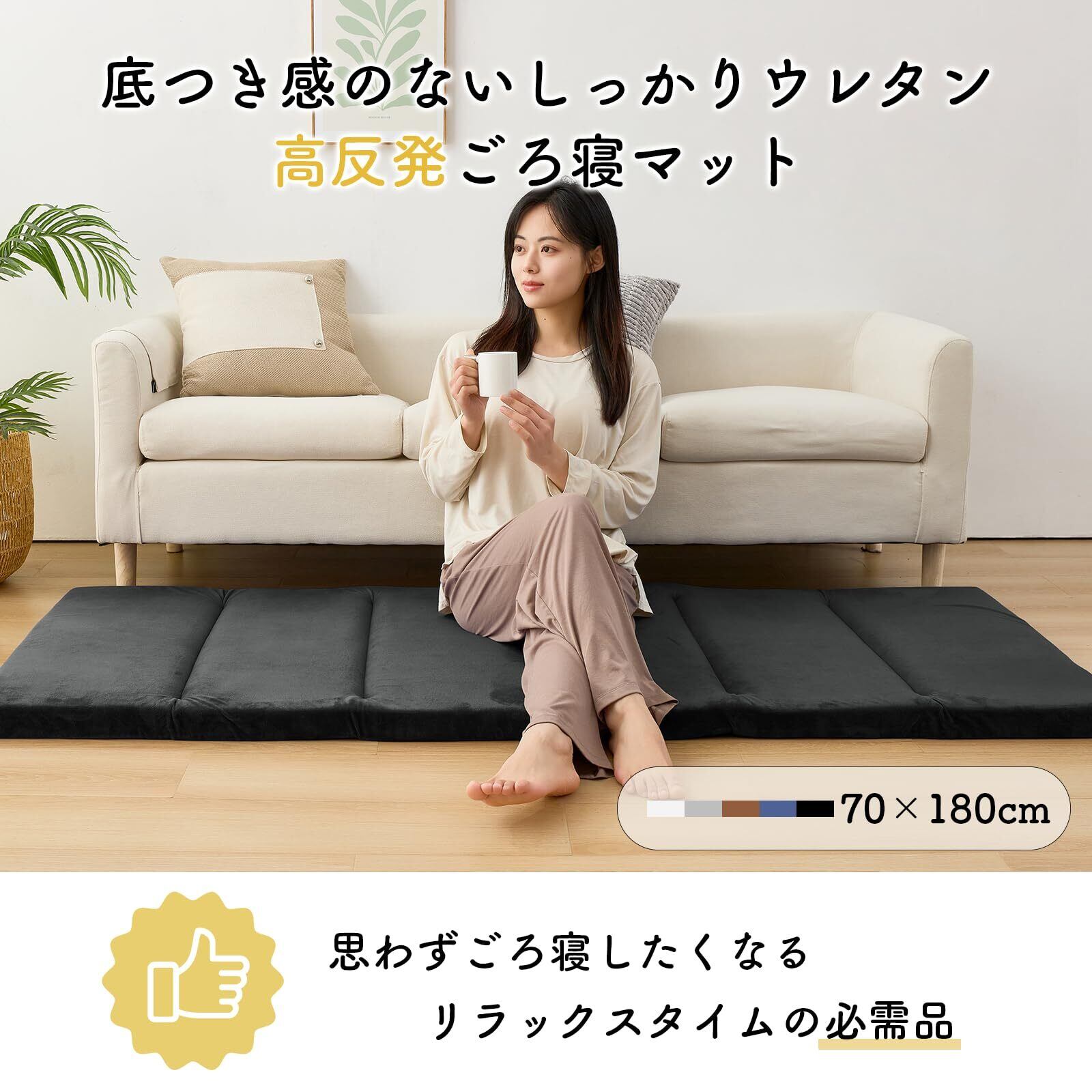 ごろ寝マット 長座布団 70×150cm高反発ウレタン190N 厚さ5cm 硬め 折りたたみ昼寝用マット ごろ寝クッション 畳める 体圧分散 底付き感無し 高耐久 抗菌防臭 防ダニ 三つ折りコンパクト収納 車中泊(70cm×150cm,ブラック)