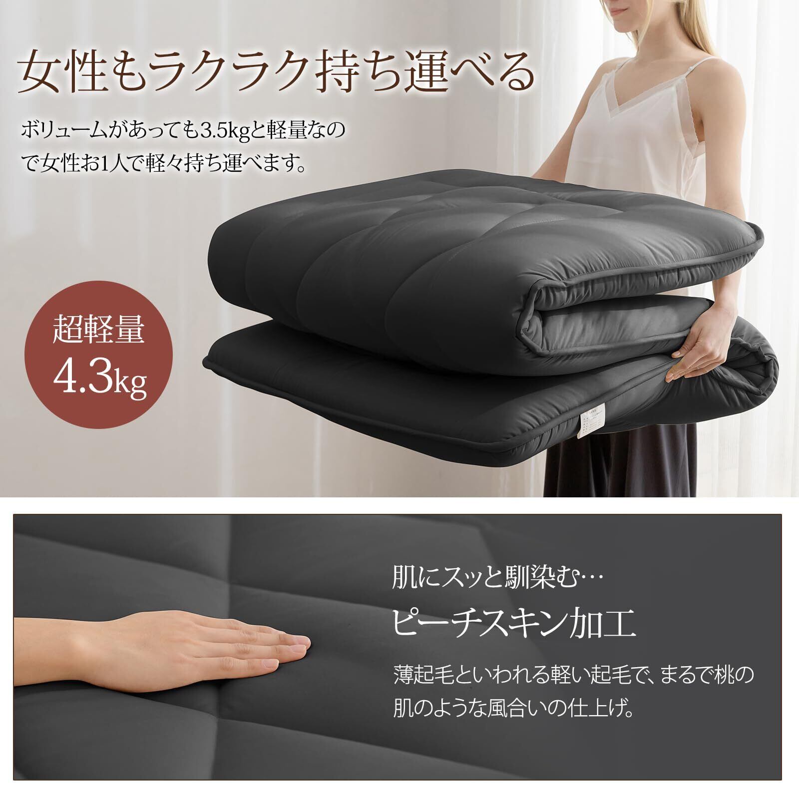 fuwawa 敷き布団 セミダブル 敷布団 厚め 10cm ボリューム 軽量 五層構造 三つ折り ピーチスキン 体圧分散 ウレタン入り 高級 折り目なし TEIJIN「マイティトップⅡ」中綿使用 オールシーズン 抗菌防臭 防ダニ 洗える しき布団 マットレス 一人暮らし 来客用布団 厚手 120×210cm ブラック