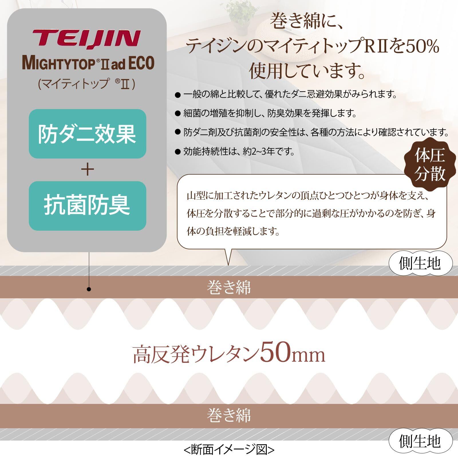 【「マイティートップⅡECO」を使用】中綿には防ダニの高機能素材、帝人のマイティトップⅡを採用しており、お子様がいるご家庭や、アレルギーなどが心配な方におすすめです。防ダニ・抗菌防臭機能があるテイジン「マイティートップⅡECO」が50%使用されています。