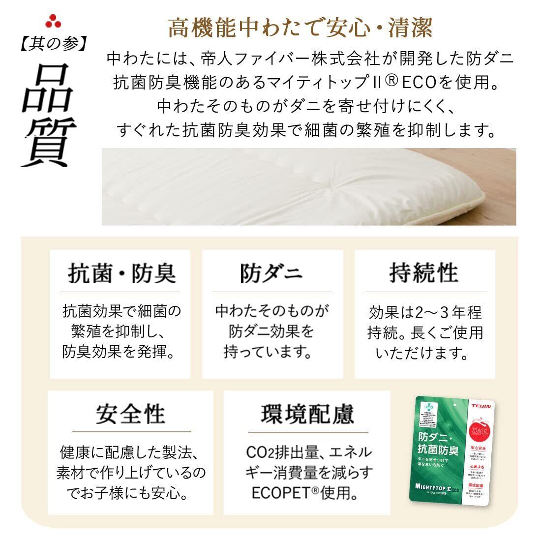 【素材】巻きわた:ポリエステル100%(うち抗菌防臭防ダニわたの帝人マイティトップ2が50%)1.0kg、中芯:ポリエステル固わた100% 1.0kg、生地:綿100%200本ブロード