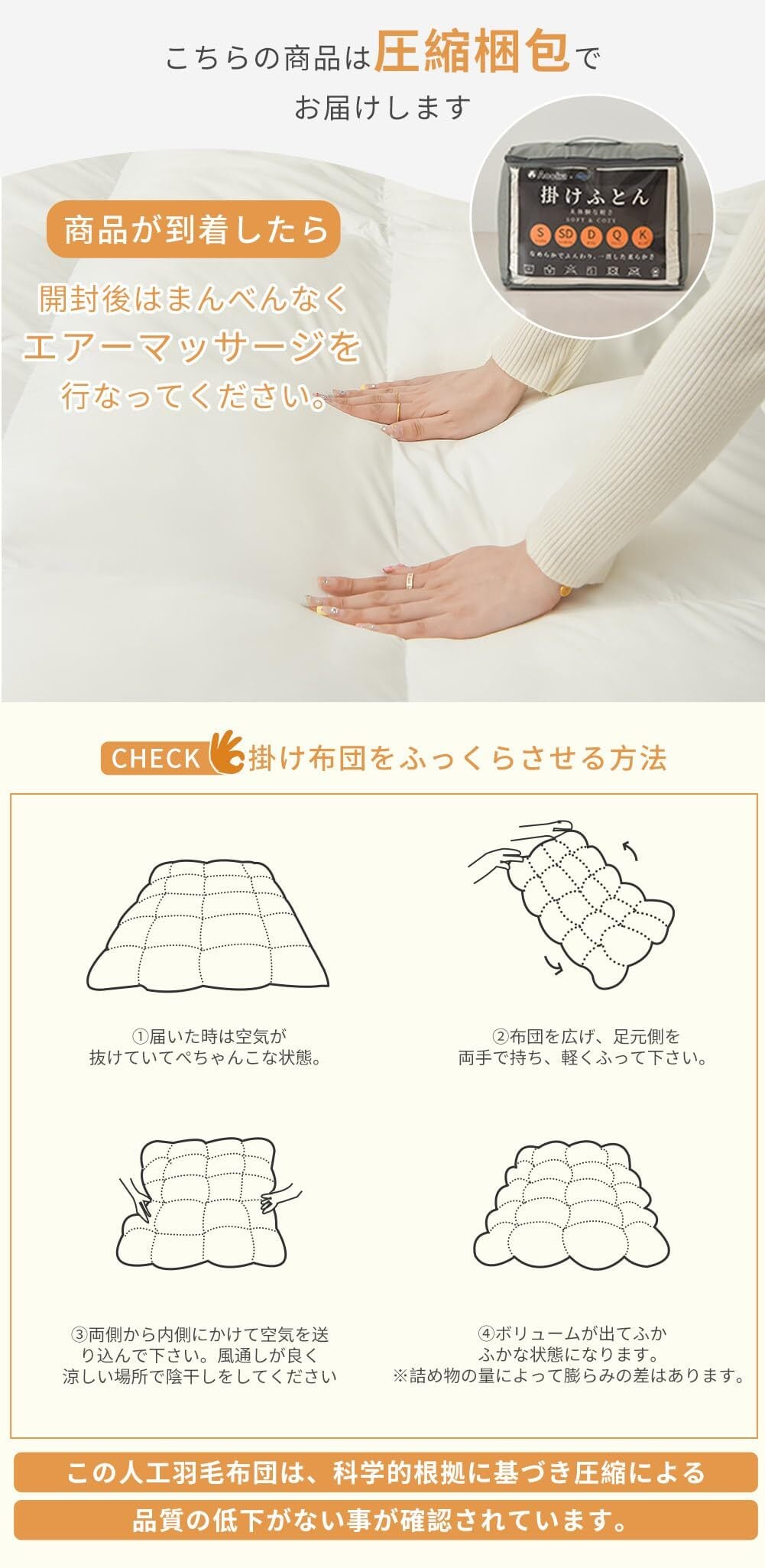 【ご注意】うちの人工羽毛ふとんは、科学的根拠に基づき圧縮によって、品質の低下がない事が確認されています。圧縮を行った複数のダクロン中わたのサンプルを用い組成分析を行ったのです、ところ、中わたの損傷は見られませんでした。商品が到着したら開封後はまんベんなくエア一マッサ一ジを行なってください。安心して長くお使いいただけます。の掛けふとんは二年があり、万が一商品に不具合がある場合は、ご連絡いただければ迅速に対応いたしますので、ご安心してお買い求めください。