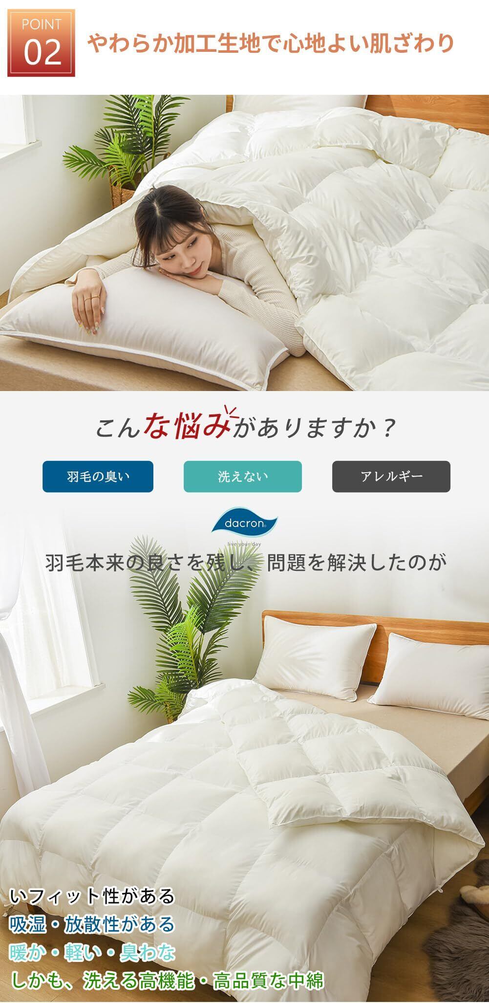 【抗菌防臭加工&丸洗いOKで】の掛け布団はデュポン社のSILVADURで消臭・抗菌が長続きます、アレルギ一対策や消臭性能がアップします、羽毛の獣臭が苦手な方やアレルギーをお持ちの方にぴったりです。しかも高機能·高品質な中綿に人工羽毛布団が丸洗いOKでいっでも清潔にできます。片寄りにくい綿を使用し、お洗濯しても中綿が固まったり片寄ったりしにくく、快適に使えます。