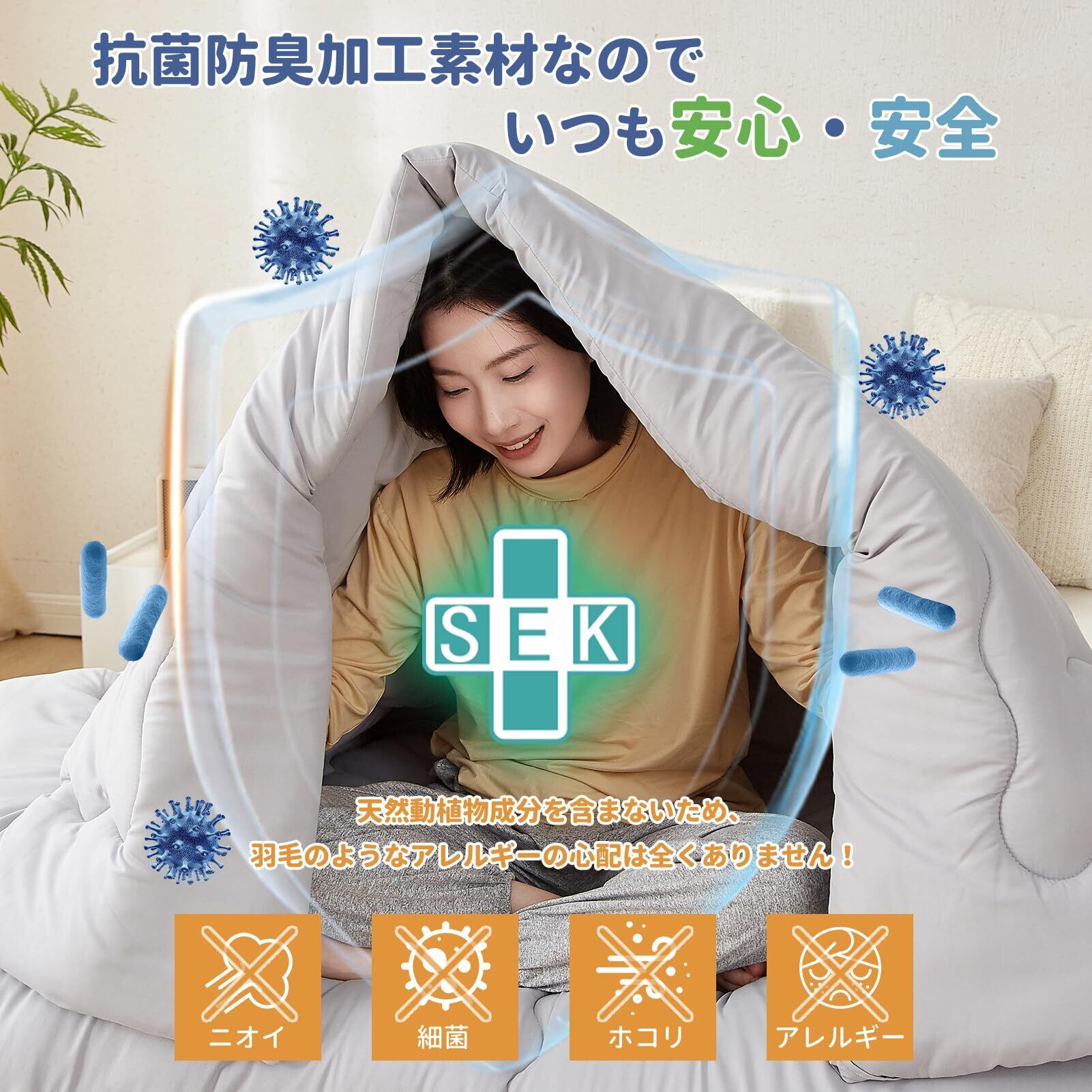 【羽毛布団の衛生上の心配を完全に解消】動植物由来の原料は一切使用しておらず、また抗菌・防臭加工も施しているため、「異臭0!」「ホコリ0!」「アレルギー0!」「カビ0!」赤ちゃんからお年寄りまで、どんな体質の方でも安全かつ安心してご使用いただけます。