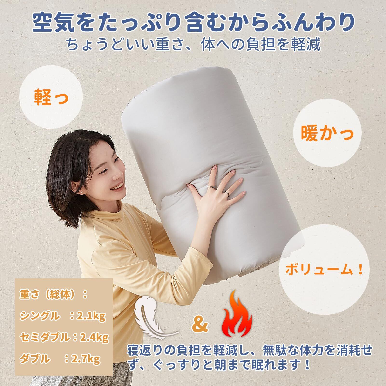 【ふんわり軽い、体への負担を最小限に】高効率な「シンサレート」中綿を使用することで、同等の保温効果を実現する場合、従来のポリ綿布団の30%〜40%の重さしか必要ありません。さらに、極細繊維を追加し、もちもち・ふんわり感を兼ね備えた、朝までぽかぽか心地よく眠ります。
