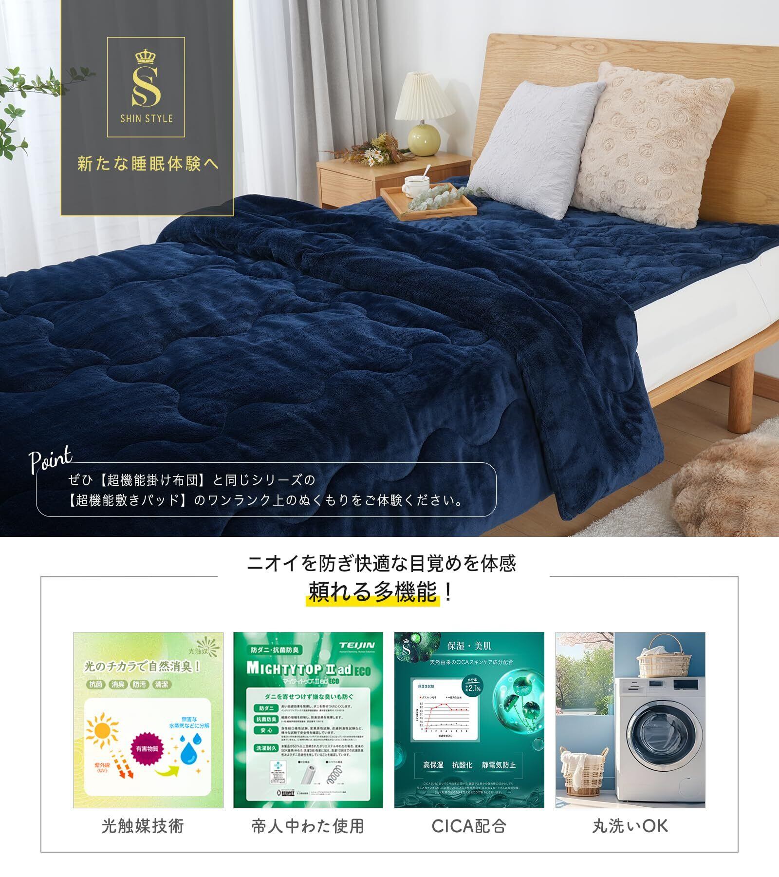 【SHIN STYLE ―新たな睡眠体験へ】 「新寝具、新体験」をコンセプトに、寝具業界で30年の経験を持つ専門家とともに、世界中を飛び回りながら新素材・新技術・新しい製法を取りいれ、革新的な寝具づくりに挑戦しています。情熱を持って、新たな“眠りスタイル”を切り拓いてまいります。お客様から「裏表が分かりにくい」というお声を頂き、ラベルを付けて裏表がひと目で分かるよう改善いたしました。今後とも、皆様のご意見を大切にしながら、より良い商品づくりに努めてまいります。ご質問やご不明点がございましたら、どうぞお気軽にお問い合わせください。誠心誠意、対応させていただきます。