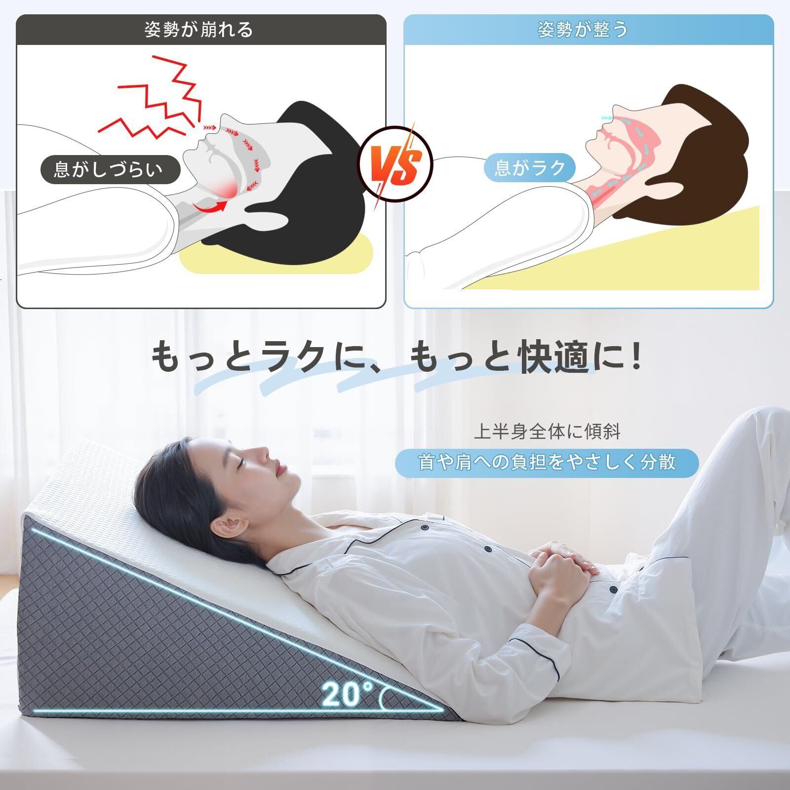 【一晩中ぐっすり心地よく】 夜、何度も寝返りを打ってしまう…そんなことはありませんか? 実は、眠るときの姿勢が大きく関係しているんです。 そこでおすすめなのが、三角クッション! 上半身をやさしく支えてくれるから、息も自然にスムーズで、気持ちよくリラックス。 心地よい眠りが続いて、朝までぐっすり。