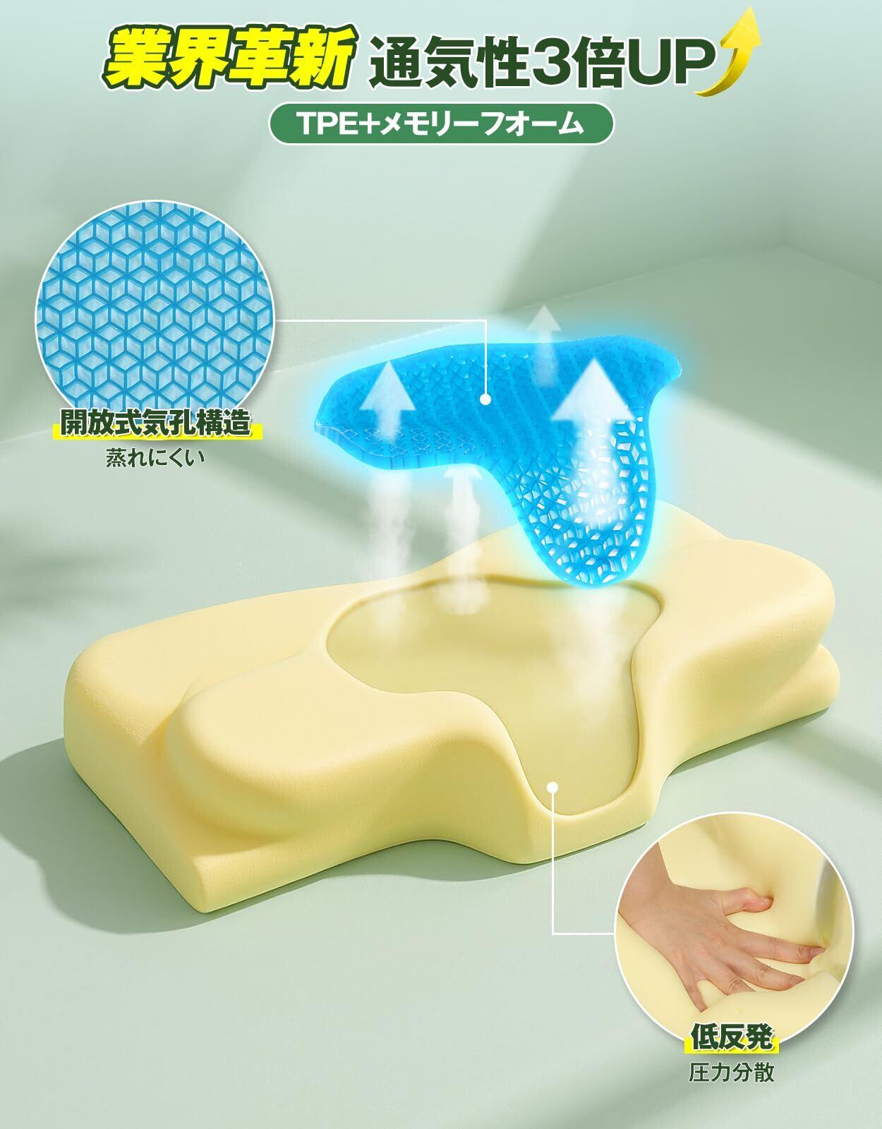 【温度安定保持 + 通気性60%向上↑】 TPEゲル素材 + ハニカム構造=動的温控システム:季節に応じて自動調節します。夏:体熱を効率的に逃がし、涼しく通気性抜群。冬:首元が冷えず、温かく快適。 Tillmulya 安眠枕 枕头 は人体との接触面の温度が2~3℃低下(実験室データ)。TPEハニカム開放構造で放熱の自動調節して従来のメモリーフォームよりも優れた通気性(3倍通気)で、ムレ感を大幅に軽減。夜中の汗や日本の湿気が多い夏の気候にもぴったり!