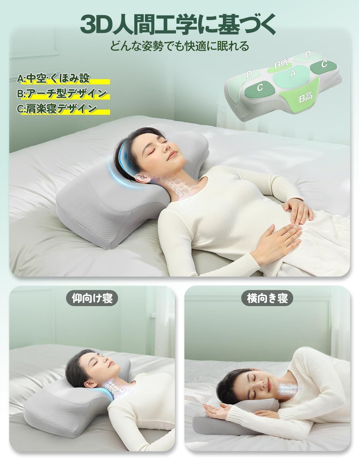 【頭・首・肩にフィットする3D立体人間工学設計】 寝姿勢でも自然にフィットするデザインで、優しいサポートと極上のフィット感を実現。 頭:凹型の中空設計で頭部をしっかり支える 首:アーチ型デザインで自然な形状にフィット 肩:側睡用の高さを上げる設計で横向き寝にも最適 Tillmulya安眠枕は、横向き寝、仰向け寝、うつ伏せ寝を問わず、どの姿勢でも快適に眠れる低反発枕です。朝の目覚めも爽やかに。