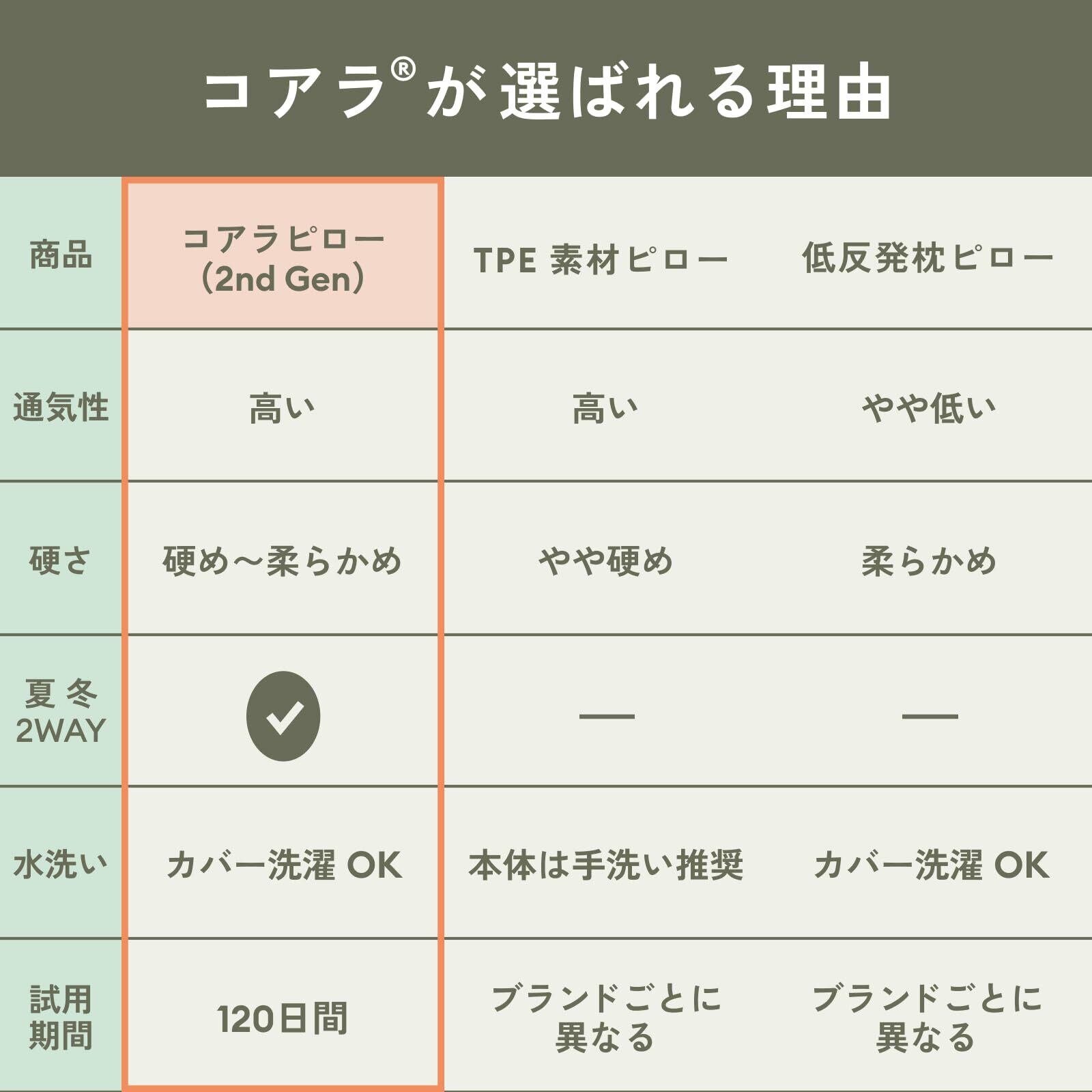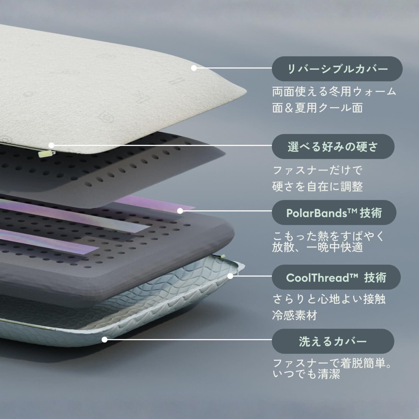 コアラのテクノロジーが、この快適さを生み出しました。ピロー内部には、睡眠中にこもりがちな熱をすばやく逃がす、熱拡散テクノロジーPolarBandsを搭載。さらにCOOLTHREADファブリックが、さらっと爽やかな肌ざわりを叶えます。ひんやりしすぎず、ちょうどいい心地よさで、頭を預けた瞬間、夢心地に。* コアラの研究開発部によるテストの結果、コアラピロー(2nd Gen)の夏用クール面の中材の温度が、従来モデルのコアラピローに比べ、6時間後の表面温度で3.41℃低下していることが確認されました。