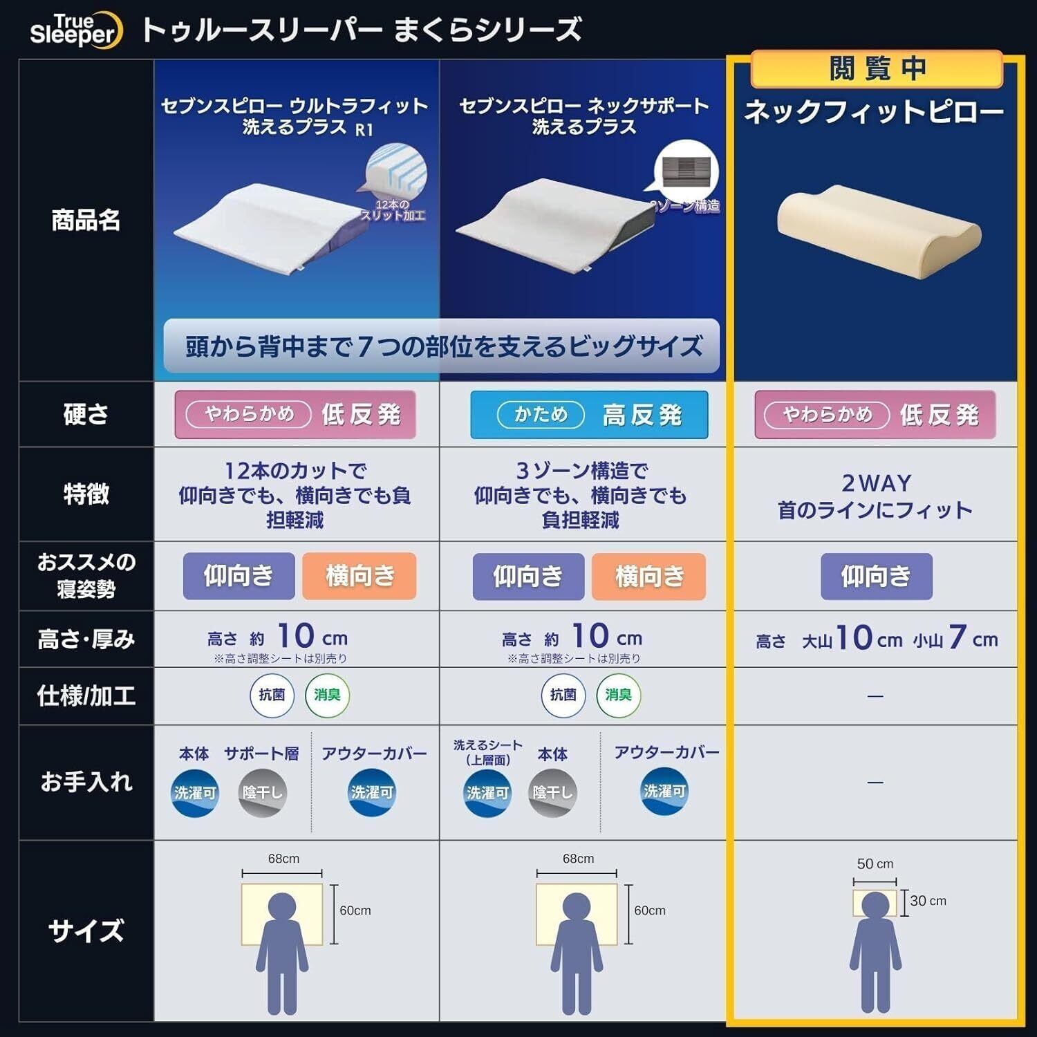 トゥルースリーパーネックフィットピローは頭から首のラインにぴったりフィットする低反発ウレタン素材を使用。首筋のゆるやかなカーブを維持して、心地よい睡眠をサポートします。