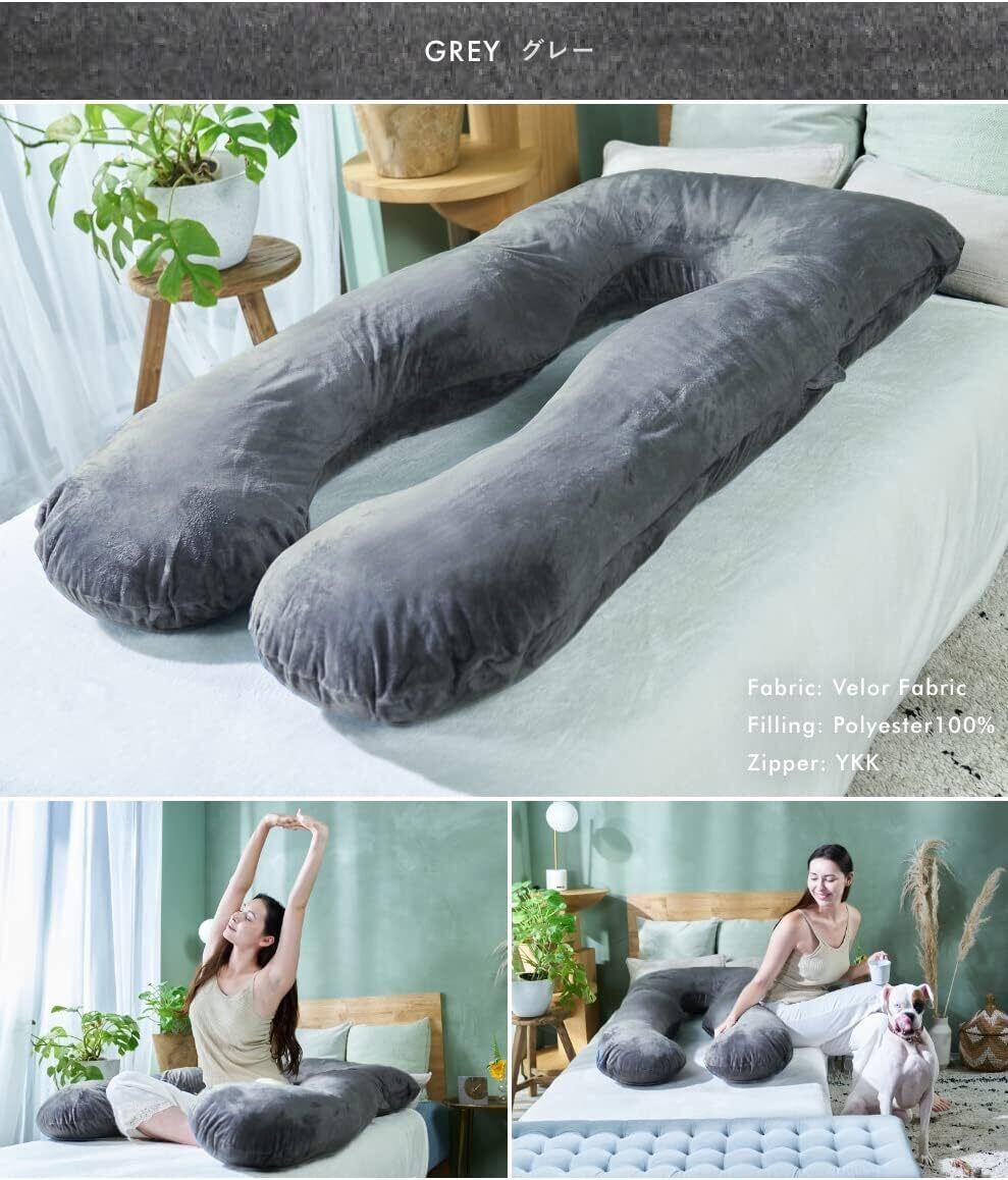 HUGMIN® ハグミン 抱き枕 【 だきまくら U字型 マタニティ 妊婦用 授乳クッション 】 腰痛 妊婦 快眠サポート 【 妊娠中・産前産後・授乳サポート 】 体圧分散 ロングクッション 寝返りスムーズ 睡眠改善 【 全身を包み込む抱き枕 】 抗菌防臭の洗えるカバー 防ダニ補充綿付 | 約140×80㎝ | ミディアム |高級ベロア |グレー