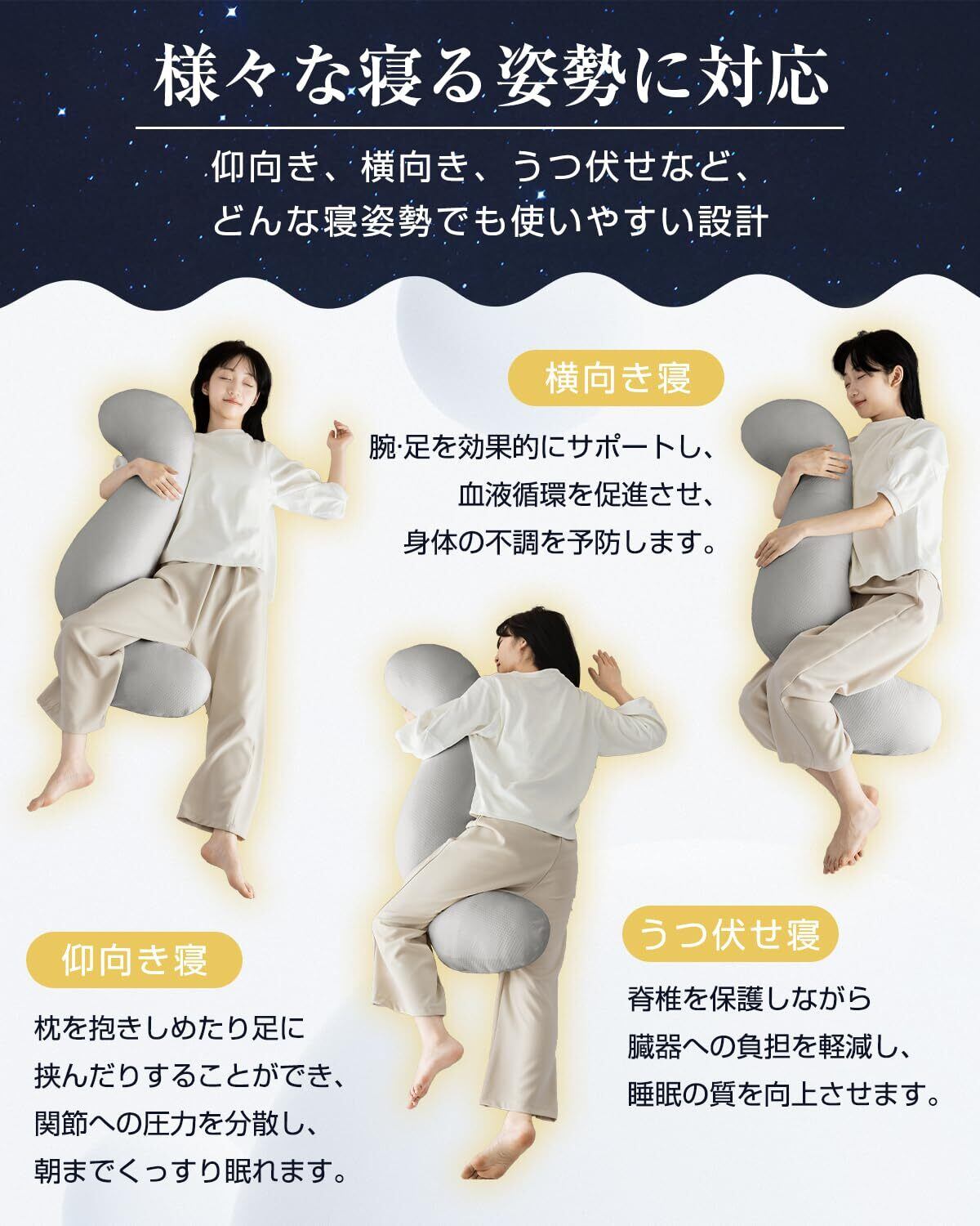 【全睡眠姿勢に対応!睡眠の新しい革命抱き枕】あなたが好きなどんな睡眠姿勢でも、このだきまくらは完璧に追随します!仰向け、横寝り、うつ伏せ寝、すべての姿勢に瞬時に適応。これまでにない心地よさで、睡眠の質を飛躍的に向上させる、あなただけの睡眠パートナーです。 仰向け寝: 「だきまくら 大きいサイズ」を足間に挟むことで、下肢の関節圧を分散し、むくみ予防と血流改善に寄与します。長時間仰臥でも腰や股関節の負担を軽減します。 横寝り: この妊婦 抱き枕は腰痛・いびき対策にも適しています。腕・足を確実にサポートして血液循環を促進し、自然な寝姿勢を維持。「だきまくら 妊婦」としても大人気です。 うつ伏せ寝: 自然なカーブで脊椎をサポート。適度な角度で身体を支え、胸や腹部へのストレスを軽減。安定感のあるデザインが夜中の寝返りを減らし、朝までぐっすり眠れます。 このだきまくら 女性用は、全てのユーザーに快適な安眠を提供します