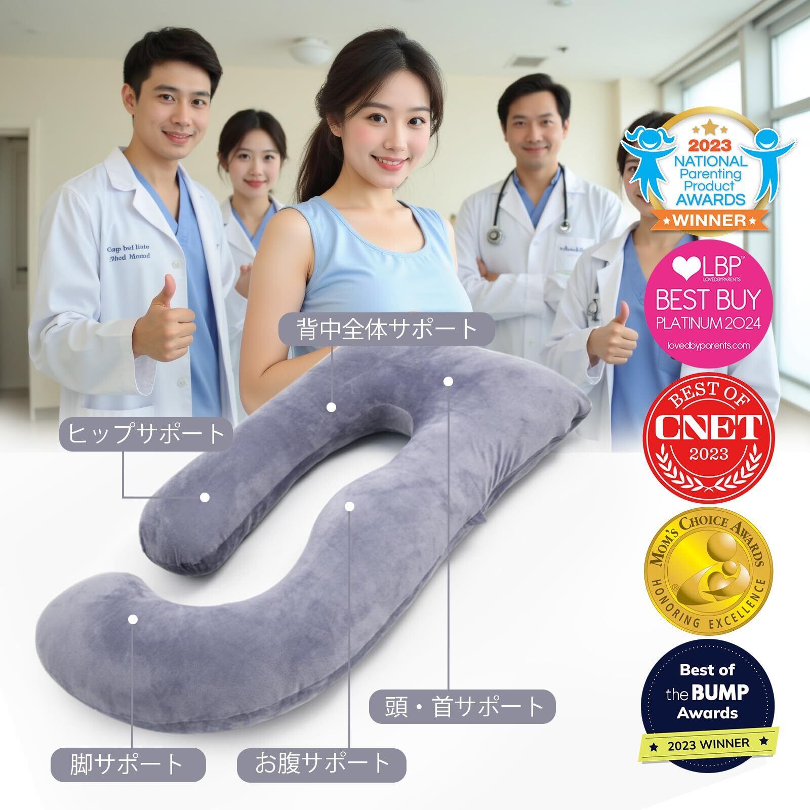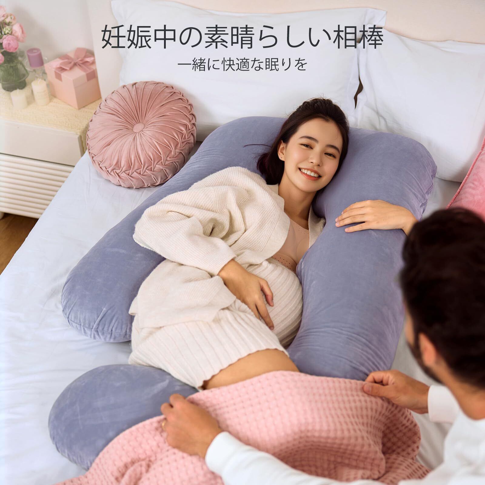全身をやさしく支える:だきまくら 女性用のU字型枕。頭から足先まで包み込み、横向き寝にもぴったりで、妊娠中の快適な眠りをサポートします。