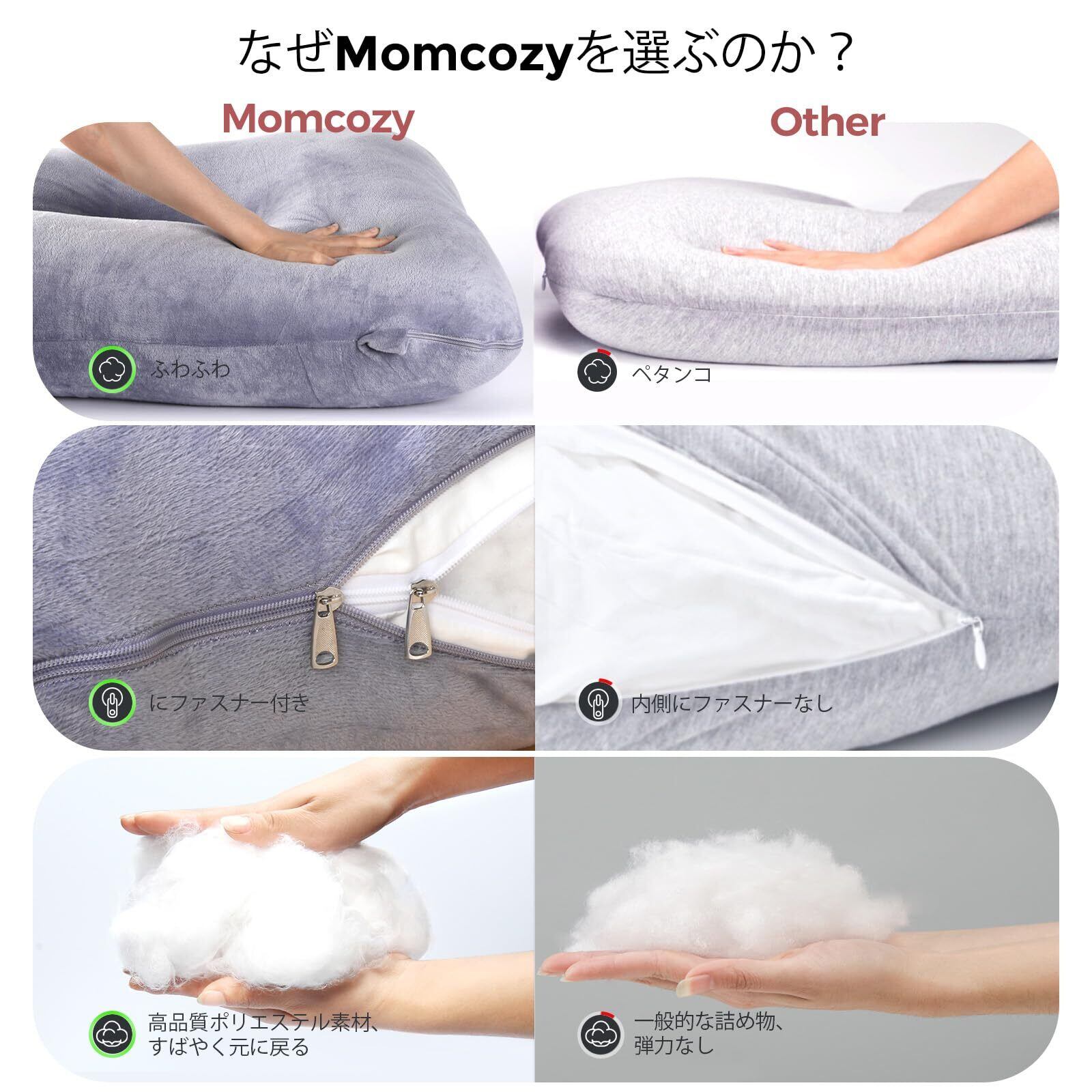 誰にでもやさしい:横向き寝の方、腰痛にお悩みの方、または脚を包み込むようなやさしいサポートがほしい方にも最適。マタニティ用お腹サポートから術後の回復期、線維筋痛症などの負担軽減まで、どんなライフステージでも役立つ、贈り物にもぴったりのマルチサポートまくらです。Momcozyの人気シリーズで安心品質。