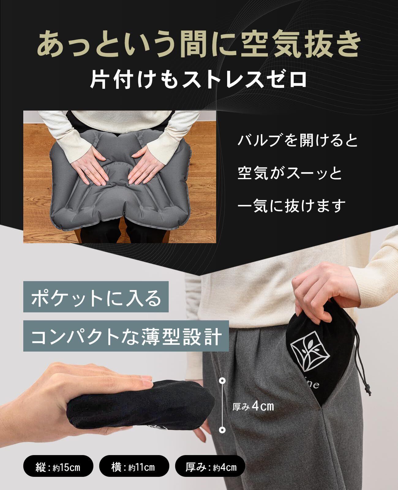 【約100gの軽量&手のひらサイズ】 卵2つほどの約100gと軽量で、持ち運びの負担を抑えやすい設計。カバンやバックパックに入れてもかさばりにくく、長距離ドライブや飛行機・夜行バスなどの移動時にもサッと取り出して使えます。ふわっとした座り心地を、どこでも。