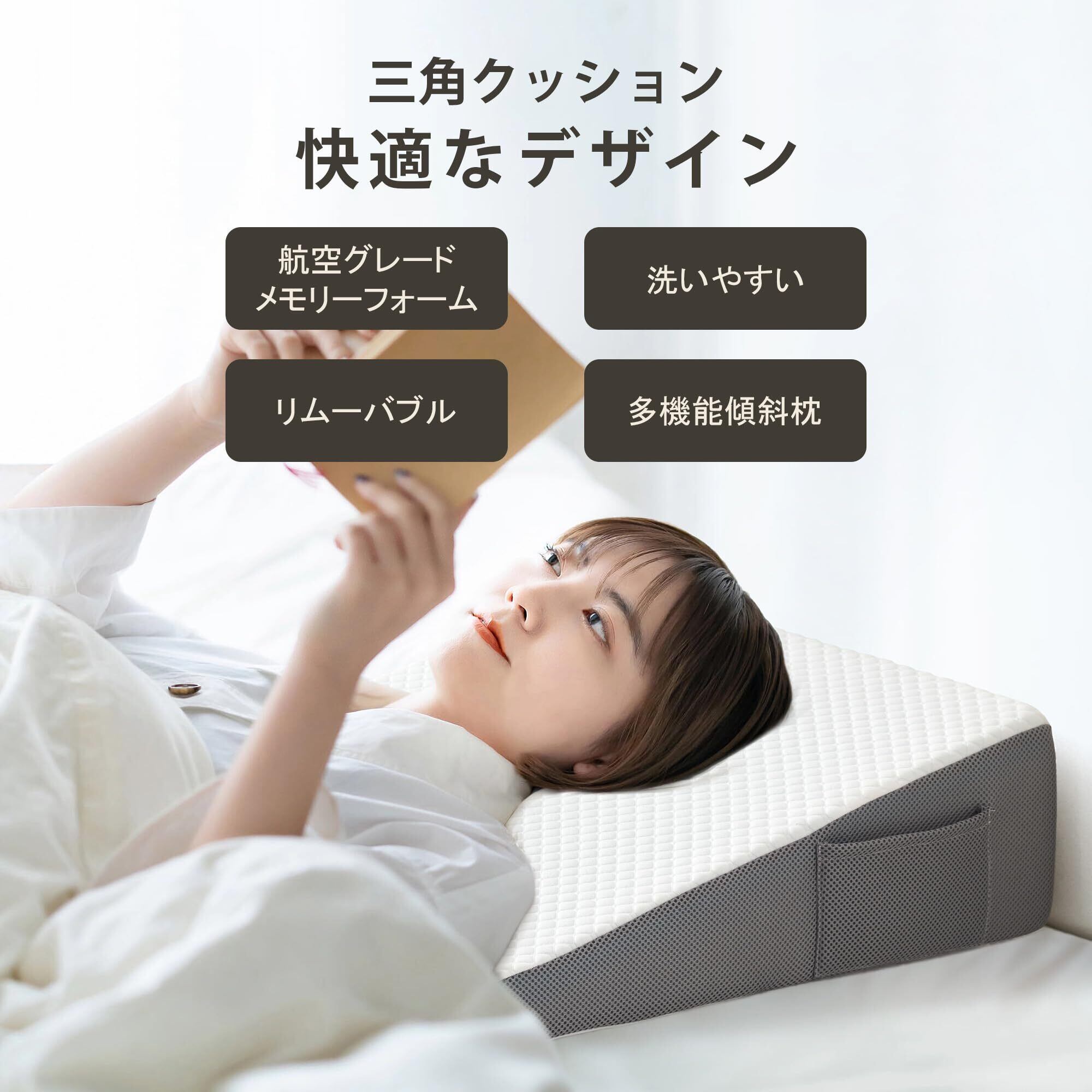 【ソフトで肌に優しいカバー】Cozymakerの三角クッションは、肌に優しいソフトな生地で作られており、側面の3D通気メッシュ生地は熱を逃し、新鮮な空気を循環させるので、汗ばむことなく、快適で涼しい睡眠をお楽しみいただけます。さらに、両側には異なる開口方向の特別なポケットがあり、眼鏡、リモコン、携帯電話などを簡単に収納できます。カバーは取り外して洗濯でき、インサート(メモリーフォーム+フォーム)は洗濯できません。