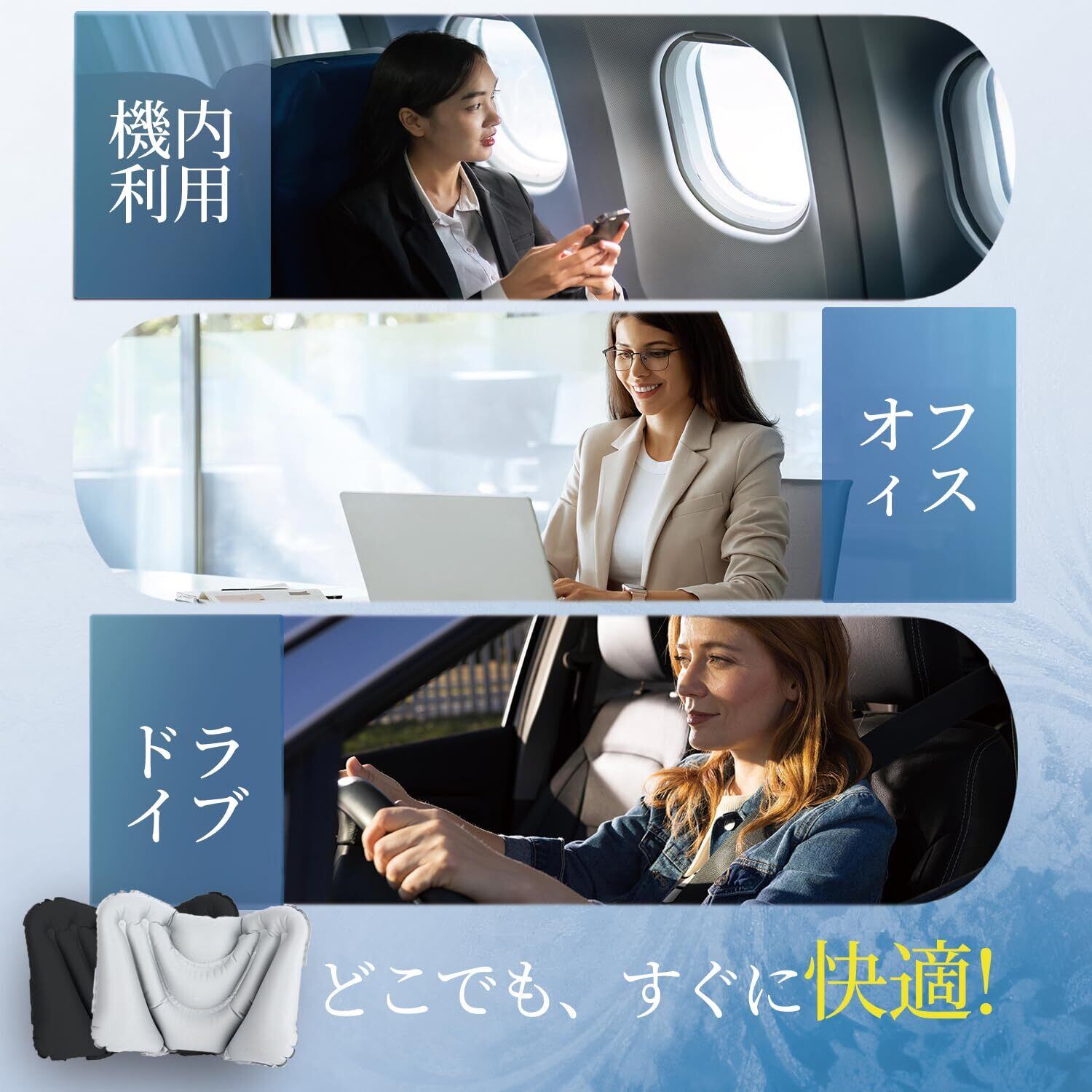 【多様なシーンで活躍】 飛行機、新幹線、夜行バスでの長距離移動はもちろん、日常の車の運転やオフィスのデスクチェア、在宅ワークにも最適です。どこでも簡単に「自分専用の快適スペース」を創り出す、必須のトラベルグッズ兼快適グッズとしてお役立てください。